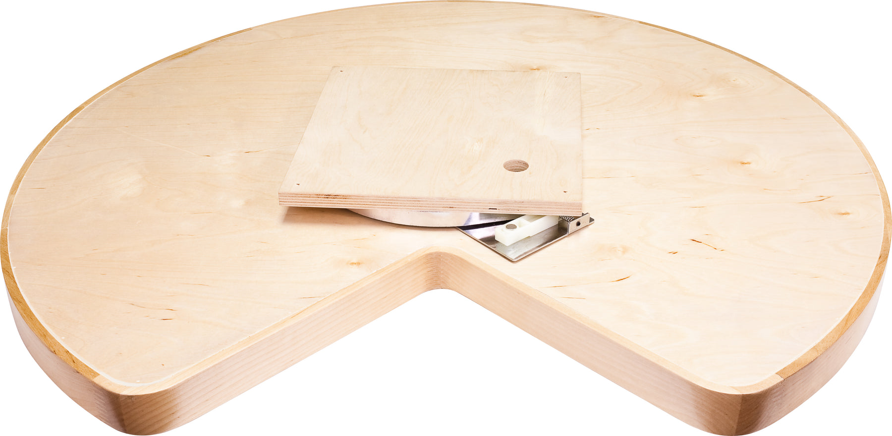 Convert your corner cabinet into shelves that spin with this 28" diameter kidney birch lazy Susan shelf with steel bearing swivel. Swivel has a positive stop, so cutout stops at the door opening. Lazy Susan shelf is made from strong 5/8" birch plywood with a 1" inside height, solid birch finger-jointed rim, all with a clear UV finish. Designed to be installed on corner cabinet bottom or cabinet shelf. Easily installs with just four screws which are included. May have limited access if counters are already installed, so best to install before counter installation. Our finger-jointed rim wood series is our highest quality offering in wood lazy Susans. To view available specifications and installation instructions select all product options.
