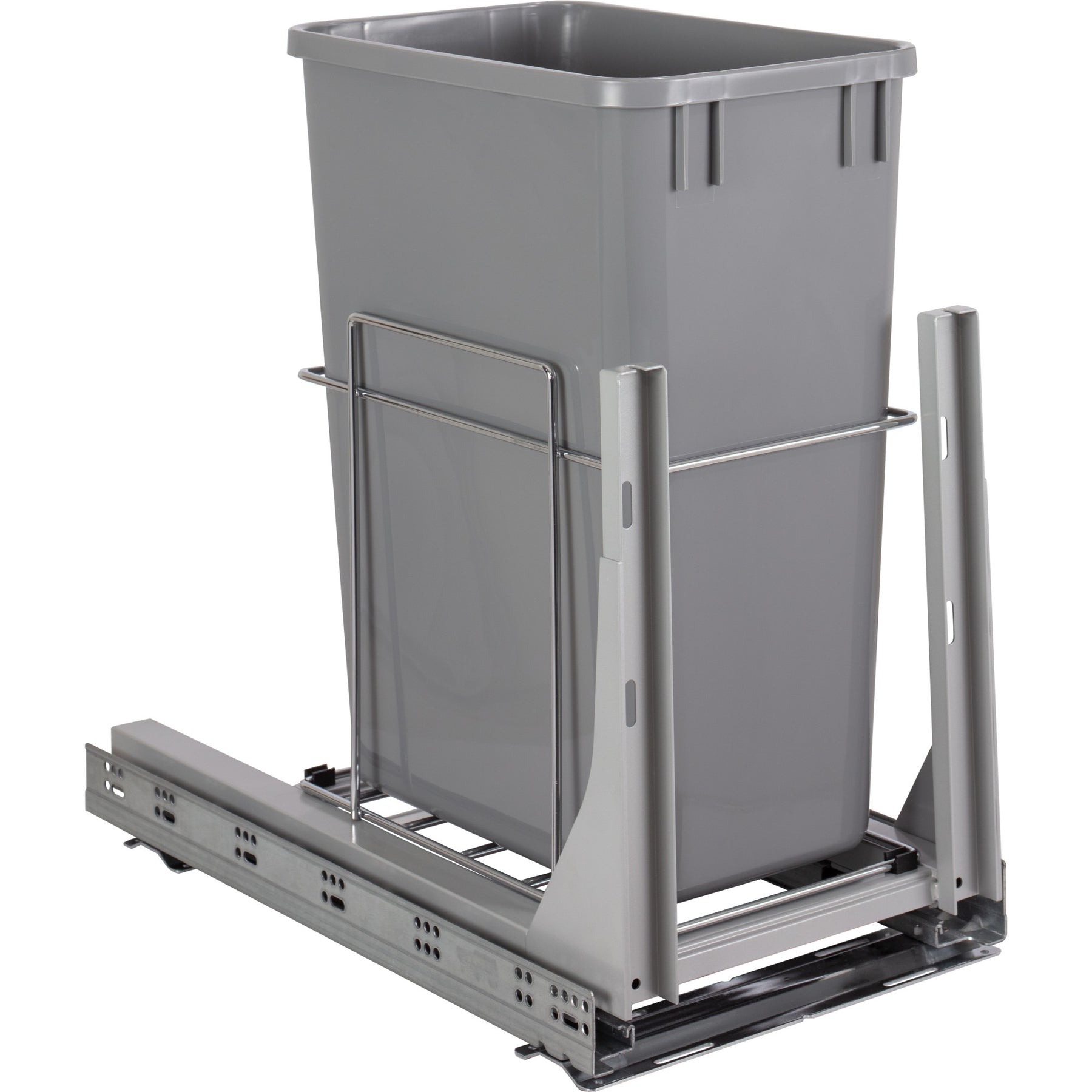 Hide trash away with this metal wire soft-close trashcan pullout. . Fits a 12" Opening. Includes door-mounting hardware. Chrome finish with one 35qt grey bins. Ships fully assembled and ready to install. To view available specifications and installation instructions select all product options.