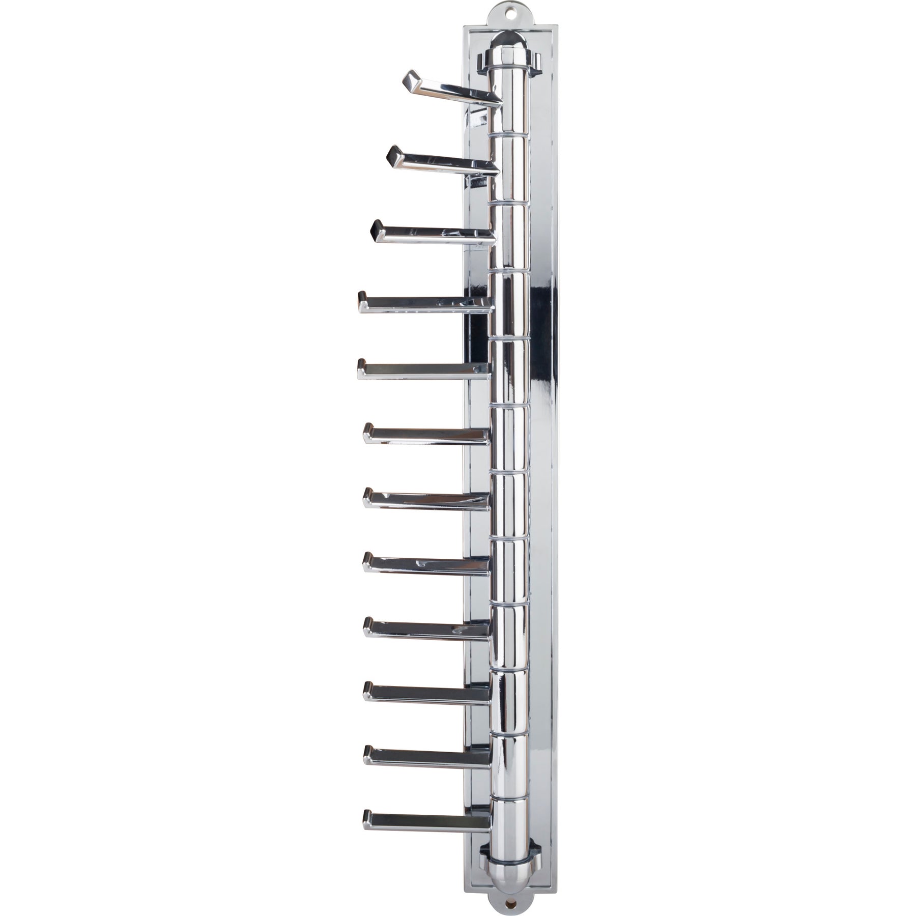 Store 12 ties, scarves, or belts with a small footprint on our 12-hook cascading tie organizer. The narrow vertical design works great on the face of a closet casing or for tight spaces like behind a door. 12 free-swing hooks allow you to easily put on or pull off items from the rack. Lip on the end of the hook keeps items from sliding off. Mounts quickly with just two screws. Polished Chrome finish. To view available specifications and installation instructions select all product options.