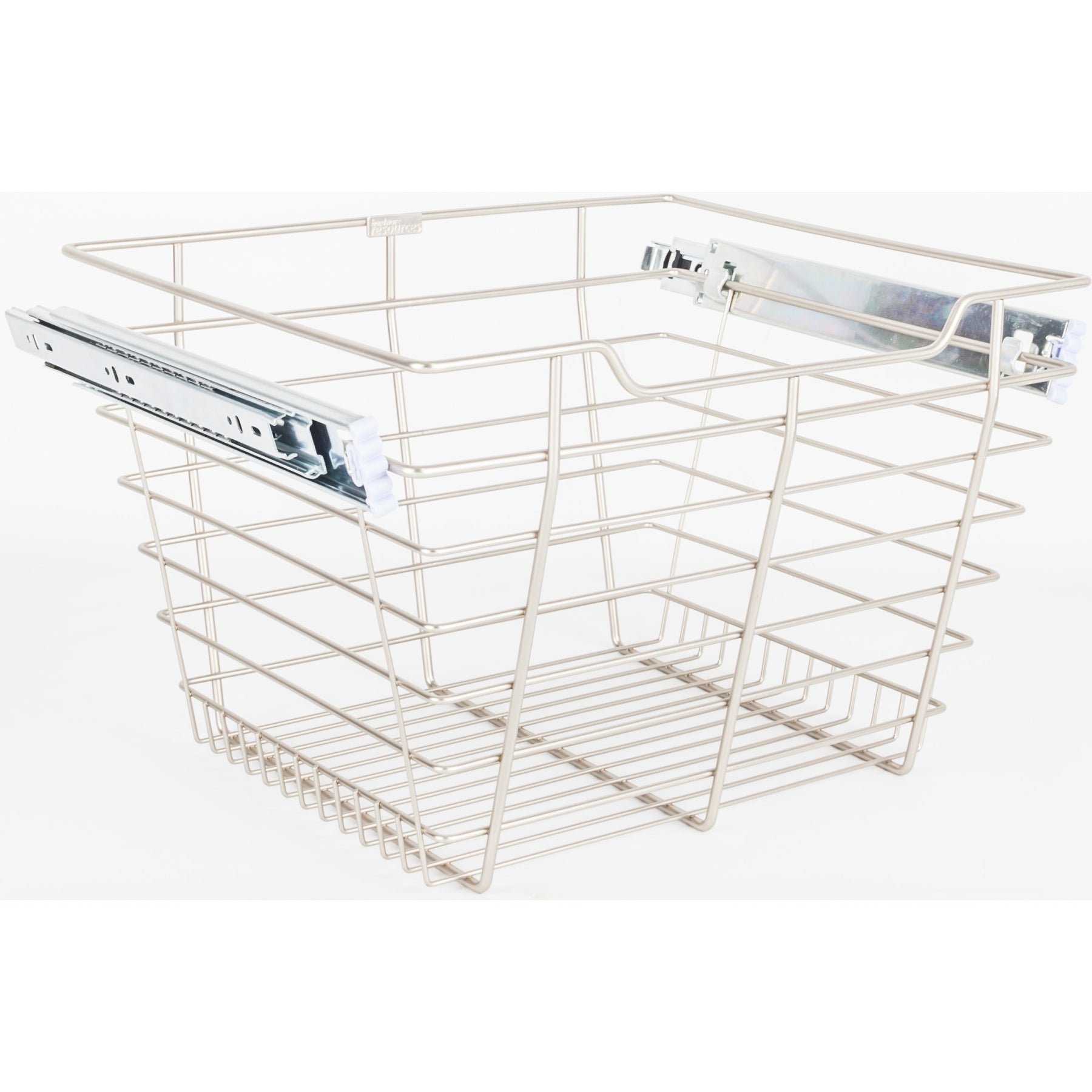 Store your closet essentials in our heavy-duty wire pullout basket. Full-extension slides and sloped front allow for easy access to all your items. Baskets easily remove from slides for ultimate portability. Closet wire baskets are a cost-effective alternative to a 5-piece drawer. Basket measures 16" deep, 17" wide, 11" high. Width is measured from the second wire and the slides add an additional inch. For 18" wide opening. Includes chrome ball bearing slides with hooks to hold basket. Satin Nickel finish. To view available specifications and installation instructions select all product options.