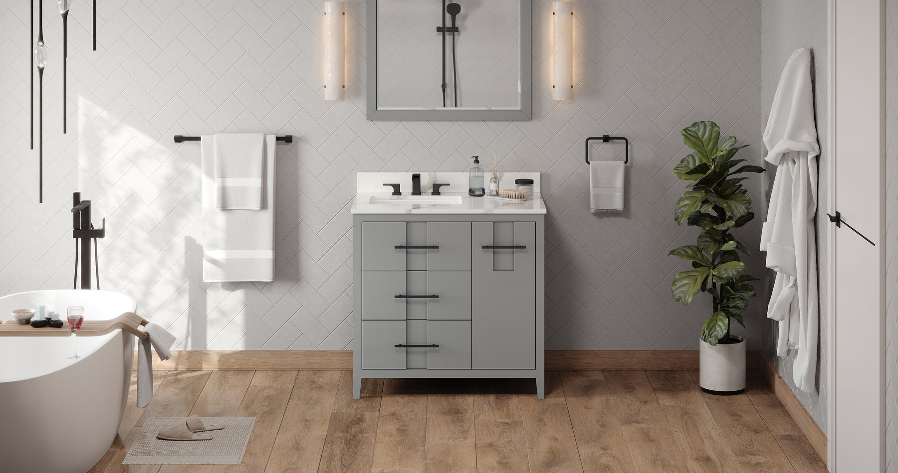 In a world of chaos, the bathroom can be transformed into your utopian Zen space with a Jeffrey Alexander Katara vanity. The smooth calmness of the doors and drawer fronts are accentuated by a slight recession behind the pulls. Each cabinet smoothly opens and closes with soft-close hinges and holds an adjustable shelf with a dovetail rollout drawer that features full -extension undermount slides for the best access to the entire drawer. Dominique knobs and pulls in Satin Bronze adorn vanities in Hale Blue and Forest Green, Brushed Gold makes its introductory appearance on the new Blue Steel vanities, Matte Black creates a refined contrast on the classic vanities in Grey and White, and Polished Chrome on Black vanities brings out a timeless combination. Top and bowl are not assembled. Some assembly required. Three holes are cut for an 8" widespread faucet, and a 4" tall backsplash is included. Included vanity top is designed to overhang ½” on each side of the vanity.