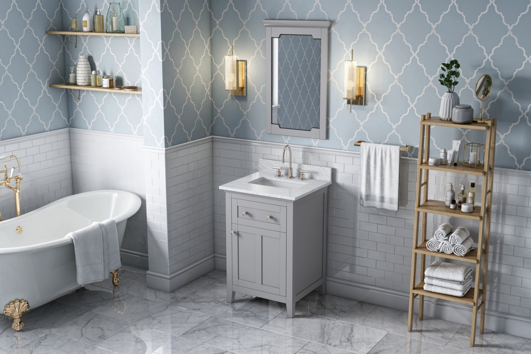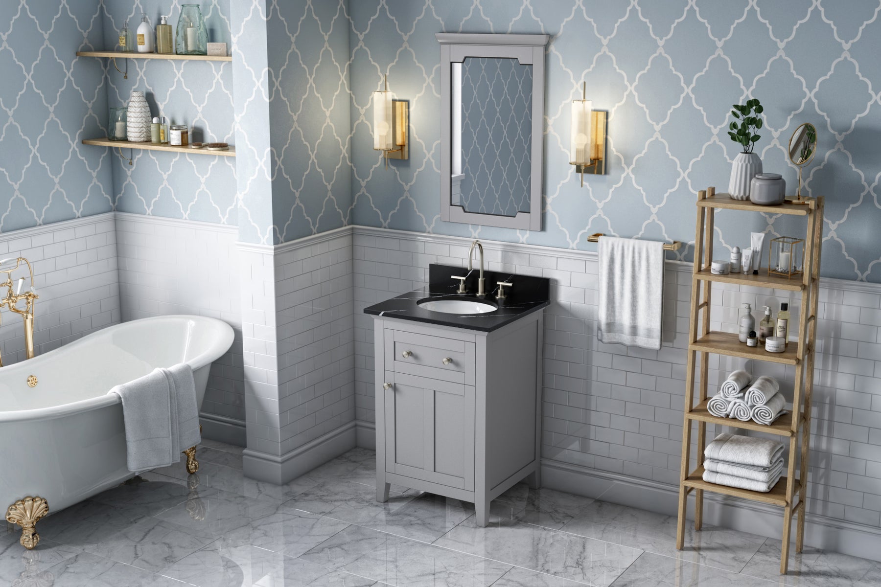 The Chatham vanity collection embraces the classic Shaker style with refined elegance. Our popular Chatham collection is available in a diverse selection of colors and sizes that provide a variety of options. This unit is equipped with a solid wood, custom-sized tipout storage tray. A hardwood rollout drawer with full-extension soft-close undermount slides is situated beneath the adjustable shelf in the cabinet. This Grey vanity is adorned with Jeffrey Alexander's Cordova collection of knobs in Satin Nickel. All slides and hinges are soft-close. This vanity can accept a 25" top with a rectangle or oval cutout. Overall dimensions: 24" W x 21-1/2" D x 35" H. Top and bowl sold separately.