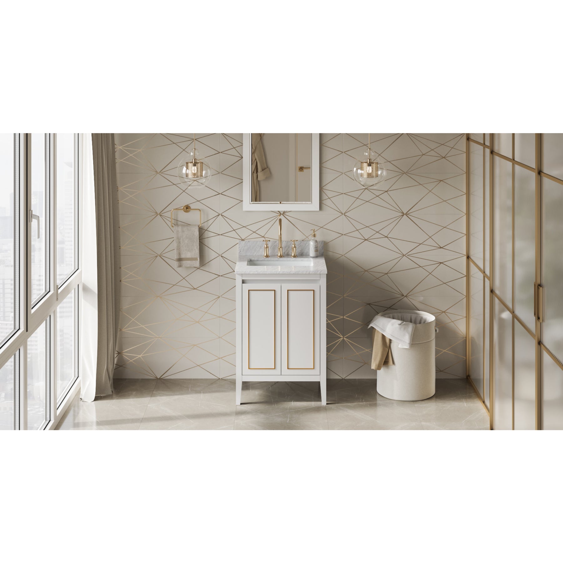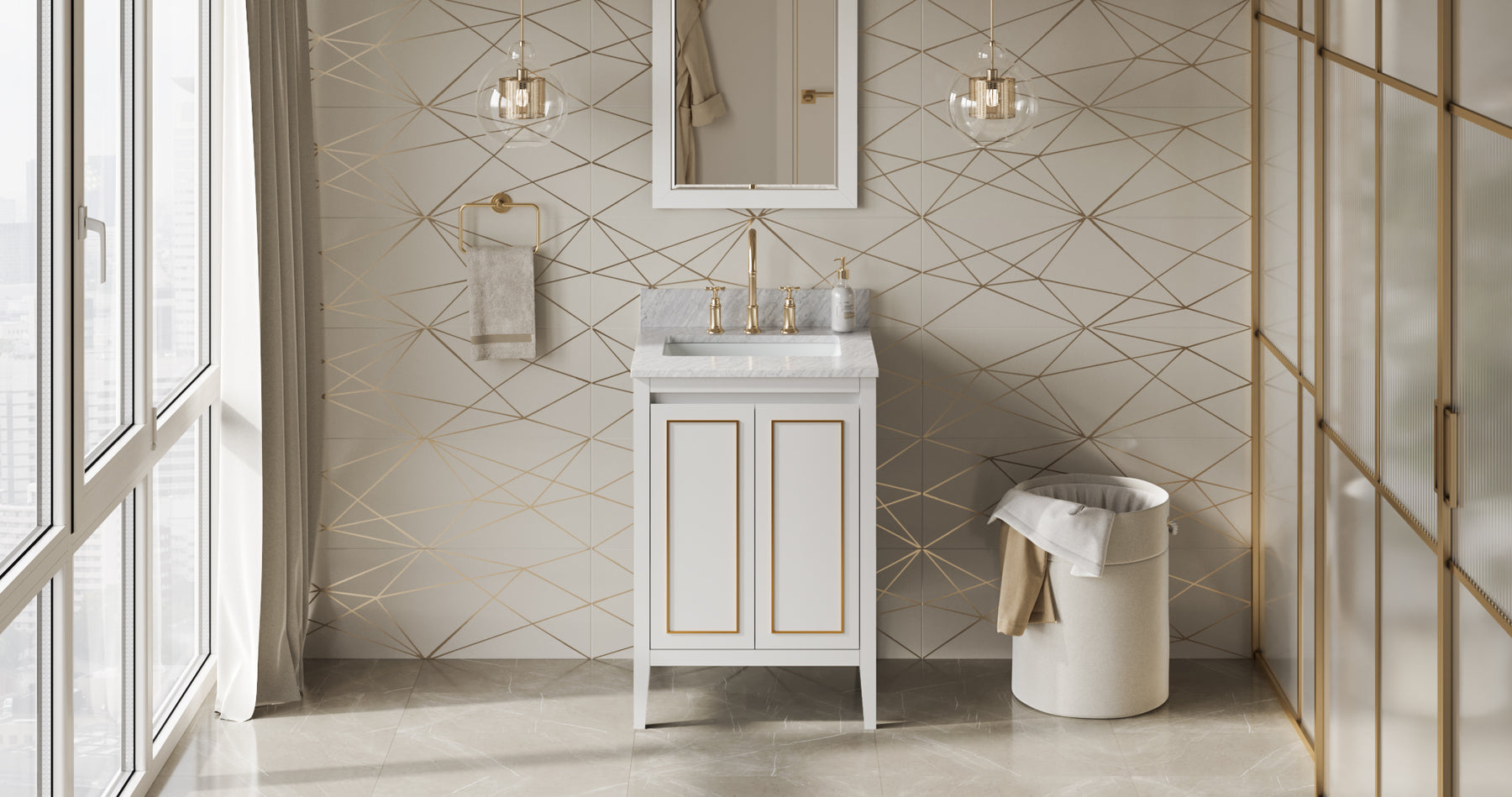 The Percival vanity collection by Jeffrey Alexander simply enriches a room with dignified grace. Refined elegance is accentuated through Percival's quiet and peaceful nature. The doors are adorned to perfectly complement the vanity's finish. This subtle metal accent trim is all the ornamentation needed to generate a resplendent presence in a room designed with class. Behind each soft-close door lies a cabinet with an adjustable shelf and dovetail rollout drawer. Storage space is maximized by equipping the rollout drawers with full-extension soft-close undermount slides. The 24" unit opens two doors to reveal a single adjustable shelf with a full-extension, soft-close dovetail rollout drawer beneath. The White vanity's metal accent trim is gilded Satin Bronze to bring out a regal style that is uniquely suited to Percival's simple and elegant design. This Percival vanity can accept a 25" top in any material with an oval or rectangle bowl cutout. Overall dimensions: 24" W x 21-1/2" D x 35" H. Top and bowl sold separately.
