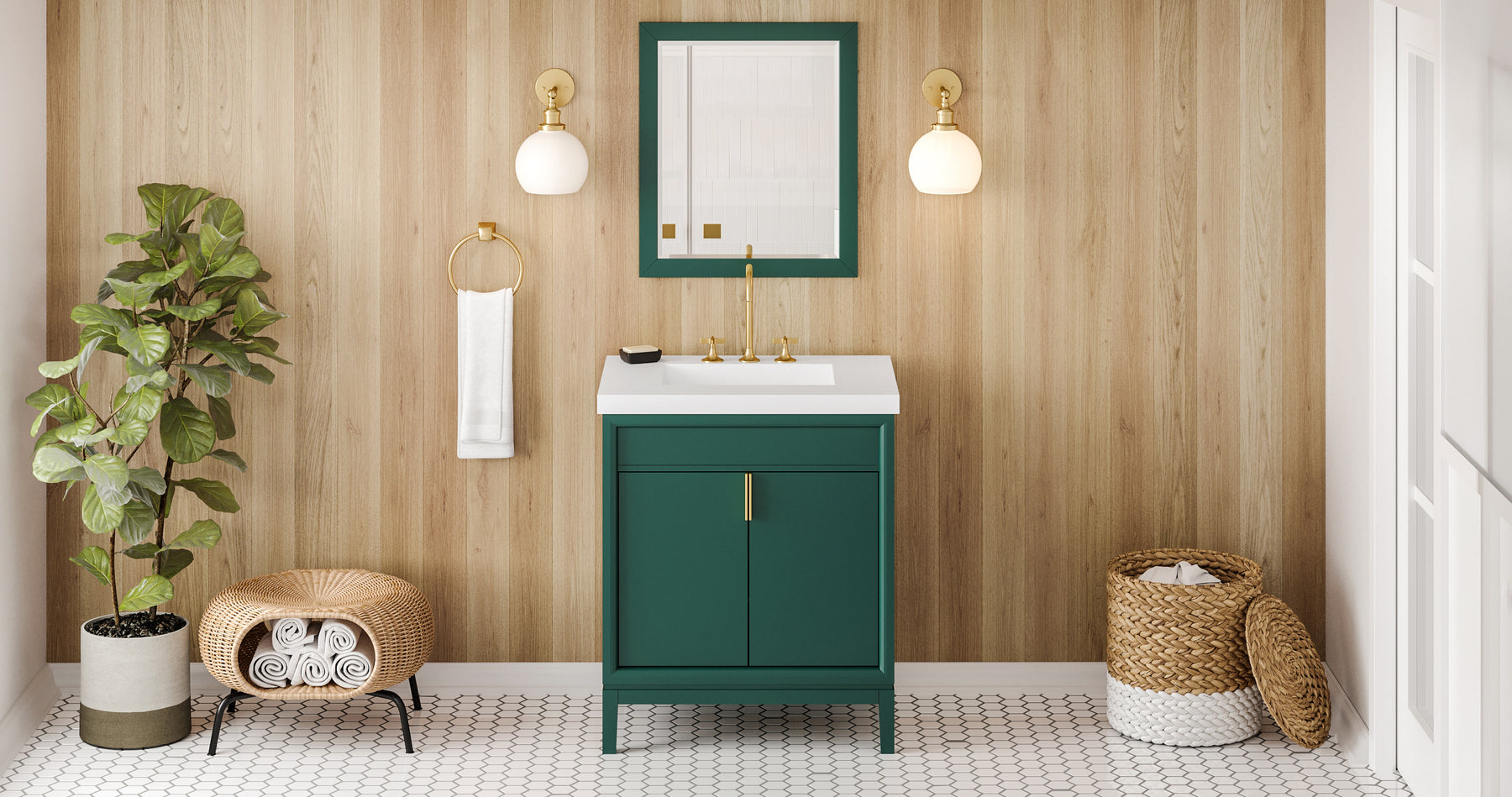 30" Forest Green Theodora Vanity, Lavante Cultured Marble Vessel Vanity Top, integrated rectangle bowl | KitchBath