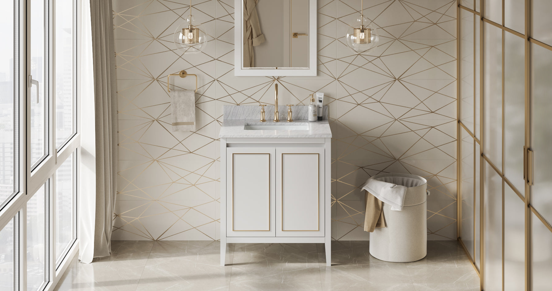 The Percival vanity collection by Jeffrey Alexander simply enriches a room with dignified grace. Refined elegance is accentuated through Percival's quiet and peaceful nature. The doors are adorned to perfectly complement the vanity's finish. This subtle metal accent trim is all the ornamentation needed to generate a resplendent presence in a room designed with class. Behind each soft-close door lies a cabinet with an adjustable shelf and dovetail rollout drawer. Storage space is maximized by equipping the rollout drawers with full-extension soft-close undermount slides. The 30" unit opens two doors to reveal a single adjustable shelf with a full-extension, soft-close dovetail rollout drawer beneath. The White vanity's metal accent trim is gilded Satin Bronze to bring out a regal style that is uniquely suited to Percival's simple and elegant design. This Percival vanity can accept a 31" top in any material with an oval or rectangle bowl cutout. Overall dimensions: 30" W x 21-1/2" D x 35" H. Top and bowl sold separately.