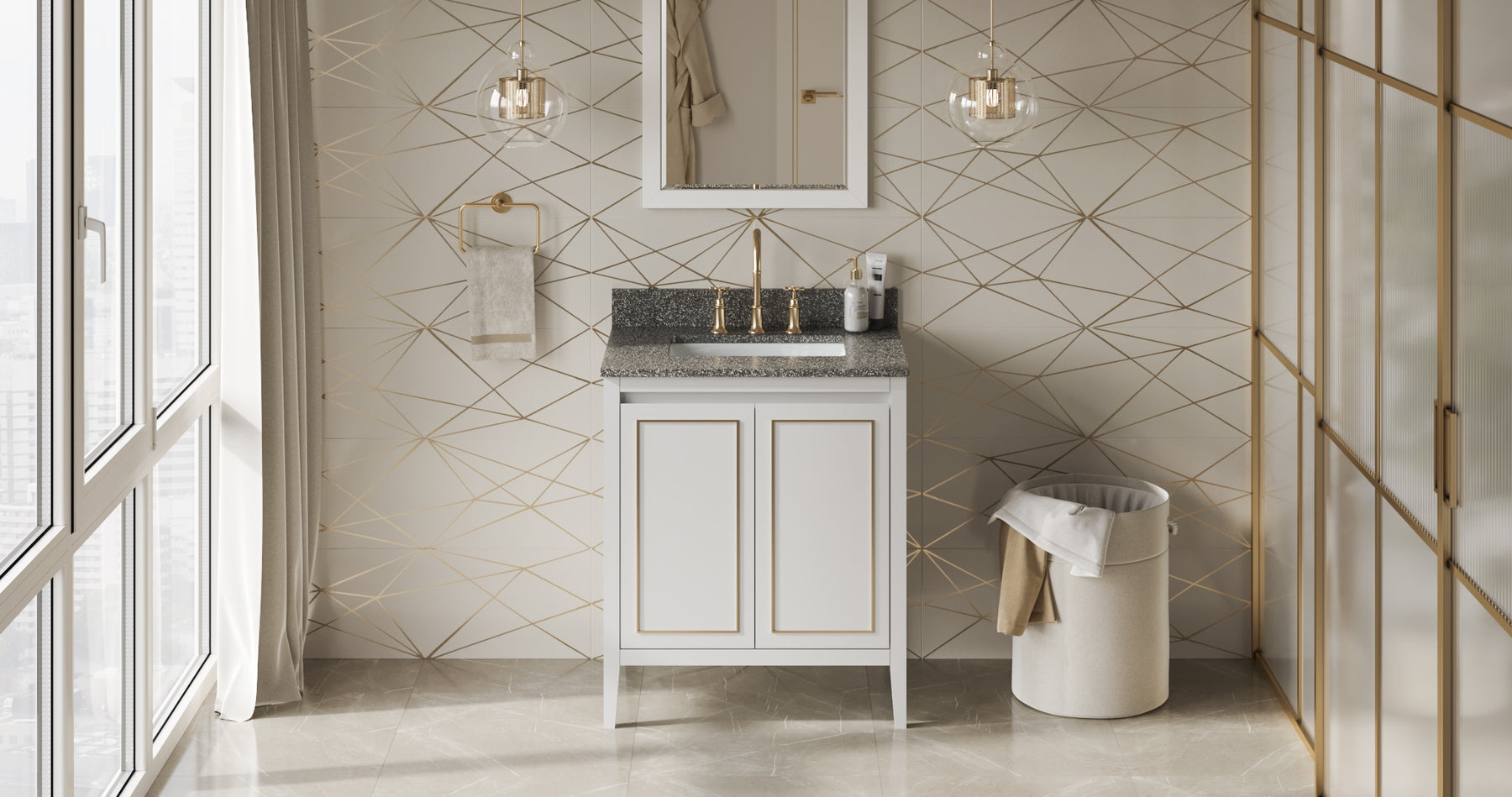 The Percival vanity collection by Jeffrey Alexander simply enriches a room with dignified grace. The subtle metal accent trim is all the ornamentation needed to generate a resplendent presence in a room designed with class. Behind each soft-close door lies a cabinet with an adjustable shelf and dovetail rollout drawer. Storage space is maximized by equipping the rollout drawers with full-extension soft-close undermount slides. Black vanities are trimmed with glistening Polished Chrome hardware, Hale Blue and White are gilded with Satin Bronze hardware, and Grey is accented with Matte Black hardware. Top and rectangular porcelain bowl are included but not assembled. See our video in the Highlights section for more information. The included top has three holes cut for an 8” widespread faucet, and a 4” tall backsplash is included. The vanity top is designed to overhang ½” on each side of the vanity.