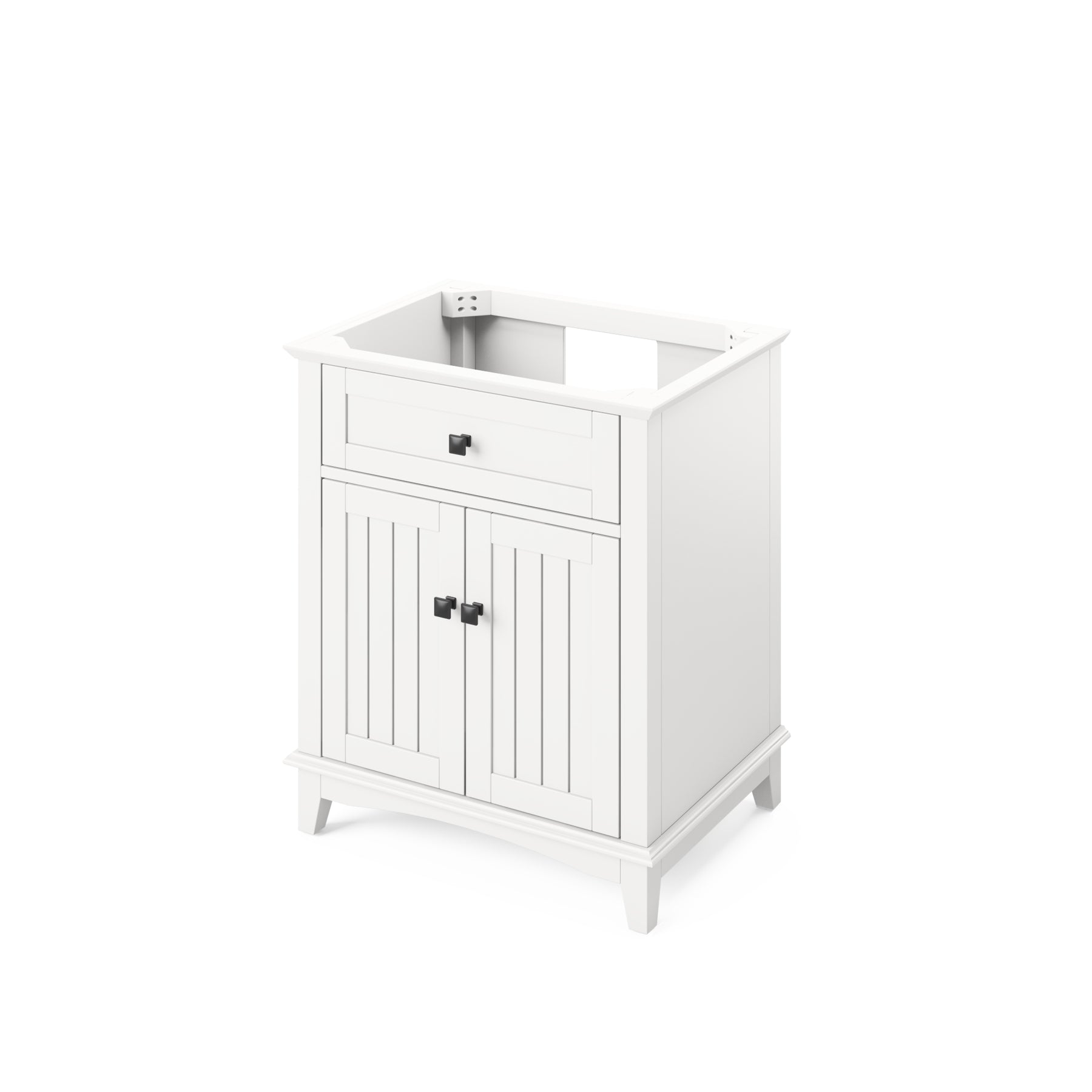 Savino provides a fresh twist on the classic Shaker style and includes innovative features to enhance the beauty of this vanity. A hardwood dovetail rollout drawer with full-extension soft-close undermount slides is integrated into the cabinet to make storage easier and more convenient. Savino vanities are also equipped with solid wood, custom-sized tipout storage trays instead of a false front drawer. This White vanity is adorned with Jeffrey Alexander's Annadale collection of knobs in trendy Matte Black. All slides and hinges are soft-close. Vanity measurements: 30" W x 21-1/2" D x 35" H. This 31" Black Granite vanity top is designed to fit 30" center bowl vanities. Golden flecks bring out the natural elements of this polished black surface. Granite is still a trending countertop material and a great option for bathrooms. The center rectangle cutout is sized to fit our undermount rectangle vanity bowl. Three holes are cut for an 8" widespread faucet, and a 4" tall backsplash is included. This vanity top is designed to overhang ½" on each side and in front of the vanity. Top measurements: 31" x 22" x 25 mm. Backsplash dimensions: 31" x 25 mm x 4". Some assembly required. Faucet not included.
