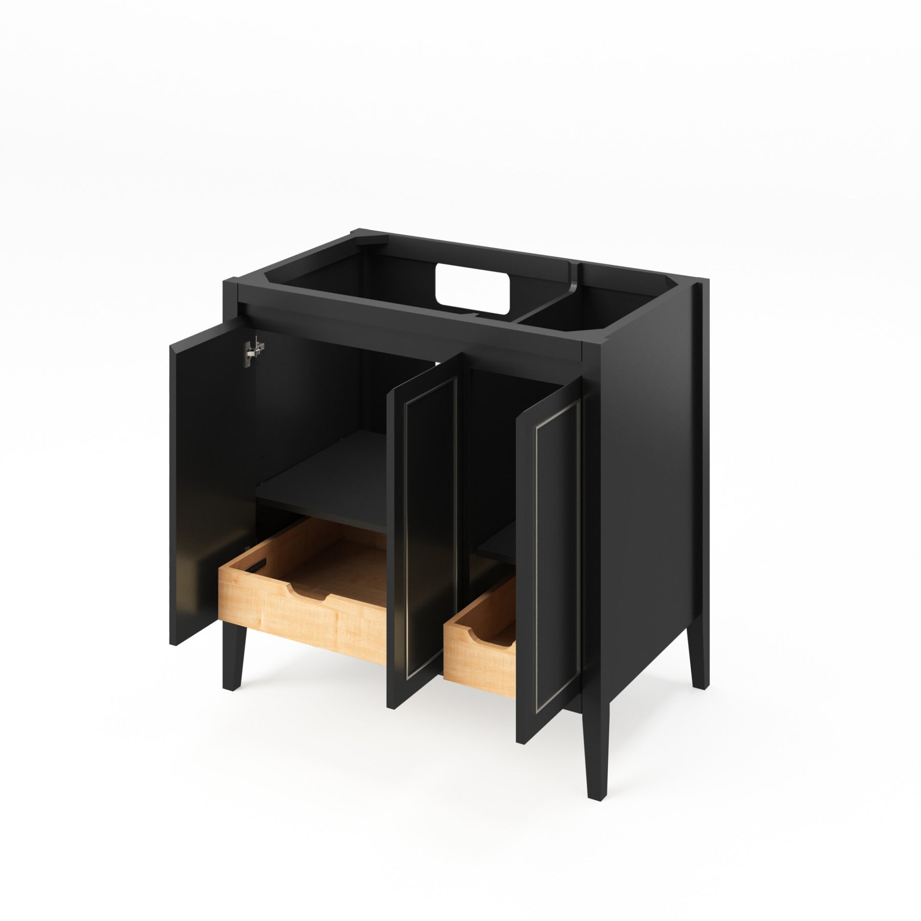 The Percival vanity collection by Jeffrey Alexander simply enriches a room with dignified grace. Refined elegance is accentuated through Percival's quiet and peaceful nature. The doors are adorned to perfectly complement the vanity's finish. This subtle metal accent trim is all the ornamentation needed to generate a resplendent presence in a room designed with class. Behind each soft-close door lies a cabinet with an adjustable shelf and dovetail rollout drawer. Storage space is maximized by equipping the rollout drawers with full-extension soft-close undermount slides. The 36" unit opens the two left doors to reveal an adjustable shelf with a full-extension, soft-close dovetail rollout drawer beneath as well as a third door that unveils a second adjustable shelf with another full-extension, soft-close dovetail rollout drawer beneath. The Black vanity's metal accent trim is a glistening Polished Chrome to bring out a style that is uniquely suited to Percival's simple and elegant design. This Percival vanity can accept a left offset 37" top in any material with an oval or rectangle bowl cutout. Overall dimensions: 36" W x 21-1/2" D x 35" H. Top and bowl sold separately.