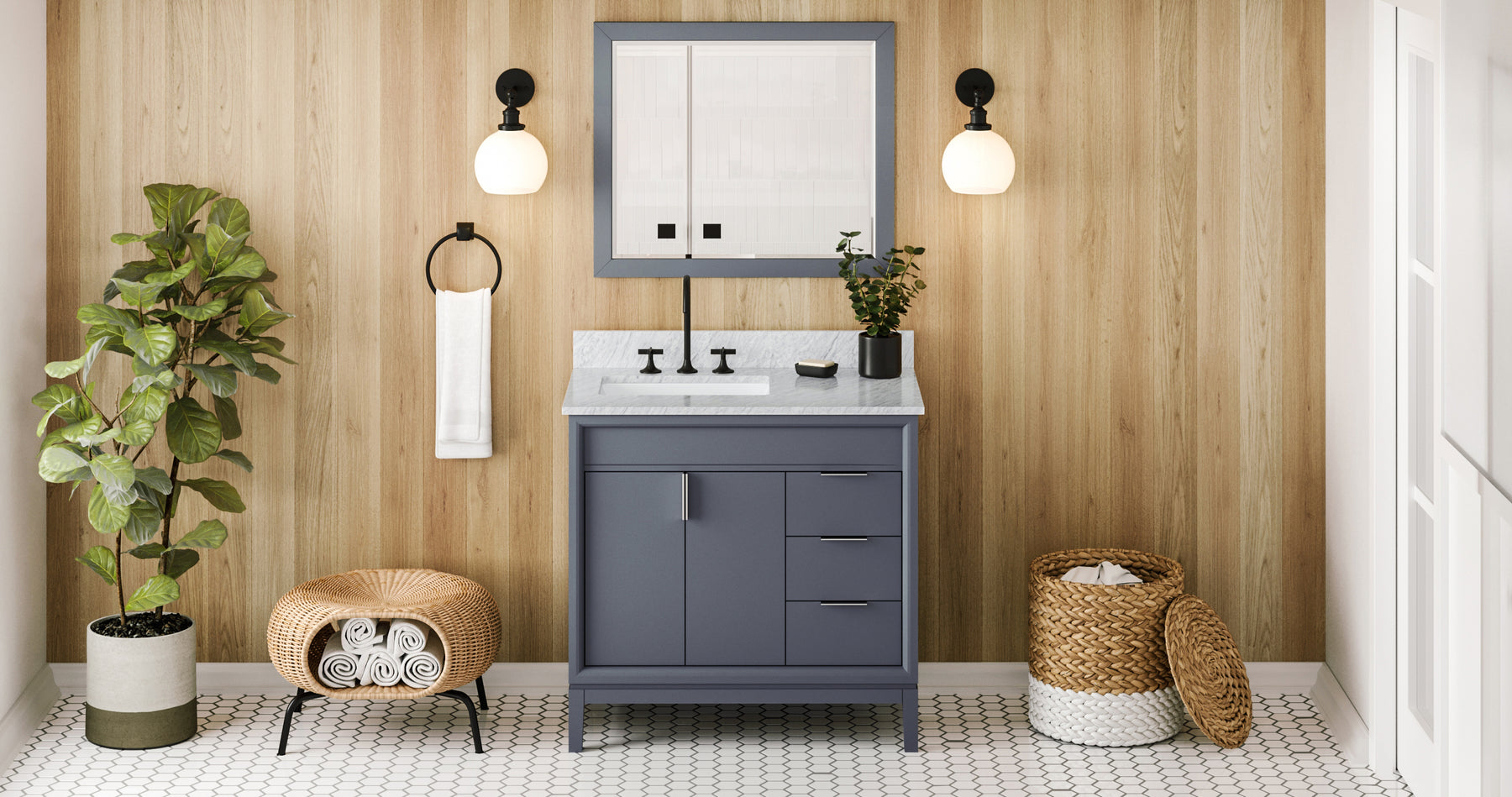 Jeffrey Alexander’s Theodora vanity collection provides a clean aesthetic using slab doors, simple lines, and minimal footprint tab pulls. The timeless mid-century design that Theodora illustrates merges gracefully with the modern style of today’s homes. Inside each cabinet is an adjustable shelf with a soft-close dovetail rollout drawer beneath. Each smooth front dovetail drawer features full-extension undermount slides for maximum storage. Polished Chrome tab pulls subtly accent vanities in Black, new Blue Steel, Grey, and White finishes, while Satin Bronze hardware accents the Hale Blue and Forest Green finishes. A top and rectangular porcelain bowl are included but not assembled. The included top has three holes cut for an 8” widespread faucet, and a 4” tall backsplash is included. The vanity top is designed to overhang 1/2” on each side of the vanity.