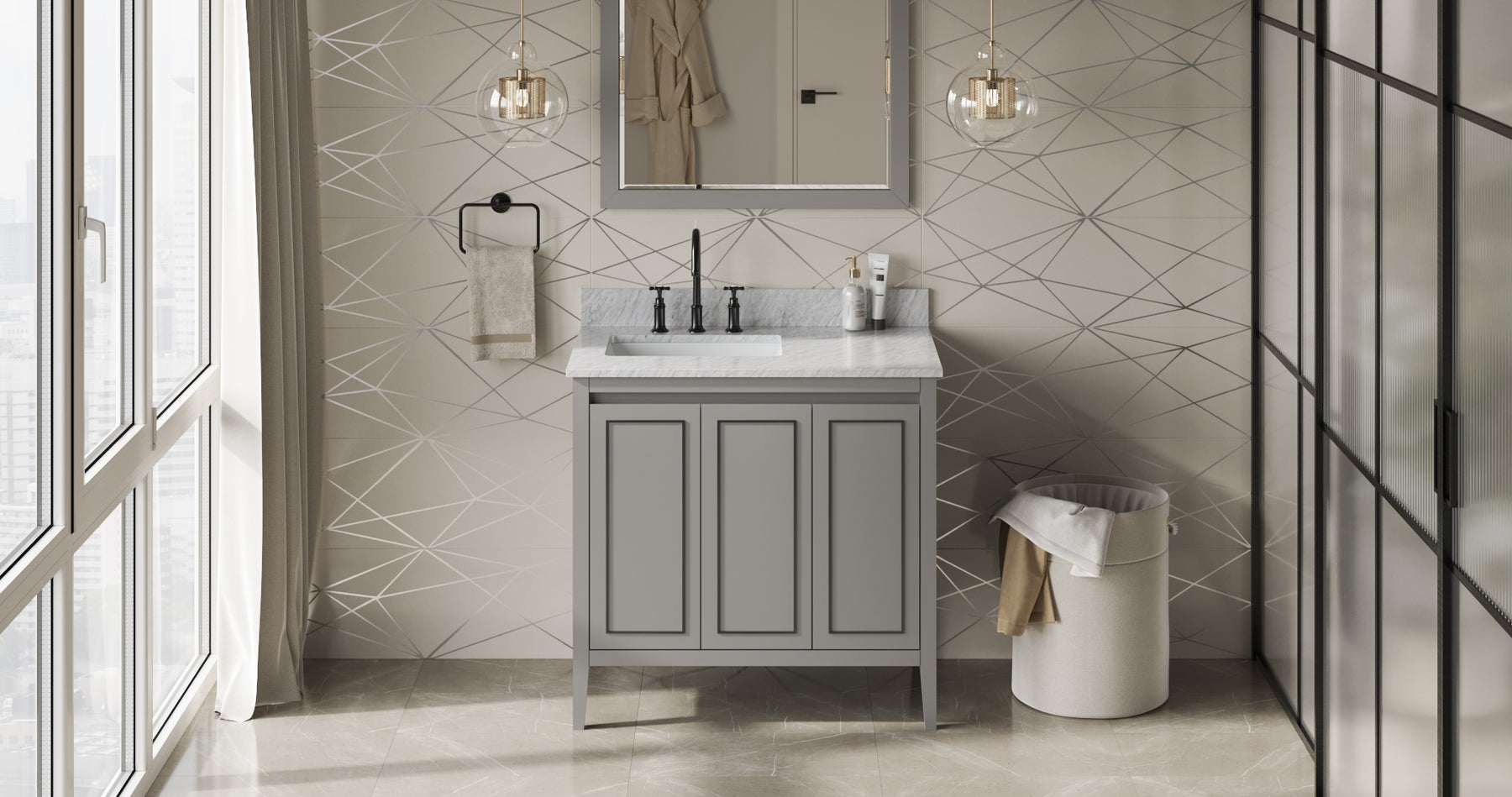 The Percival vanity collection by Jeffrey Alexander simply enriches a room with dignified grace. Refined elegance is accentuated through Percival's quiet and peaceful nature. The doors are adorned to perfectly complement the vanity's finish. This subtle metal accent trim is all the ornamentation needed to generate a resplendent presence in a room designed with class. Behind each soft-close door lies a cabinet with an adjustable shelf and dovetail rollout drawer. Storage space is maximized by equipping the rollout drawers with full-extension soft-close undermount slides. The 36" unit opens the two left doors to reveal an adjustable shelf with a full-extension, soft-close dovetail rollout drawer beneath as well as a third door that unveils a second adjustable shelf with another full-extension, soft-close dovetail rollout drawer beneath. The Grey vanity's metal trim is accented with Matte Black to bring out a style that is uniquely suited to Percival's simple and elegant design. This Percival vanity can accept a left offset 37" top in any material with an oval or rectangle bowl cutout. Overall dimensions: 36" W x 21-1/2" D x 35" H. Top and bowl sold separately.