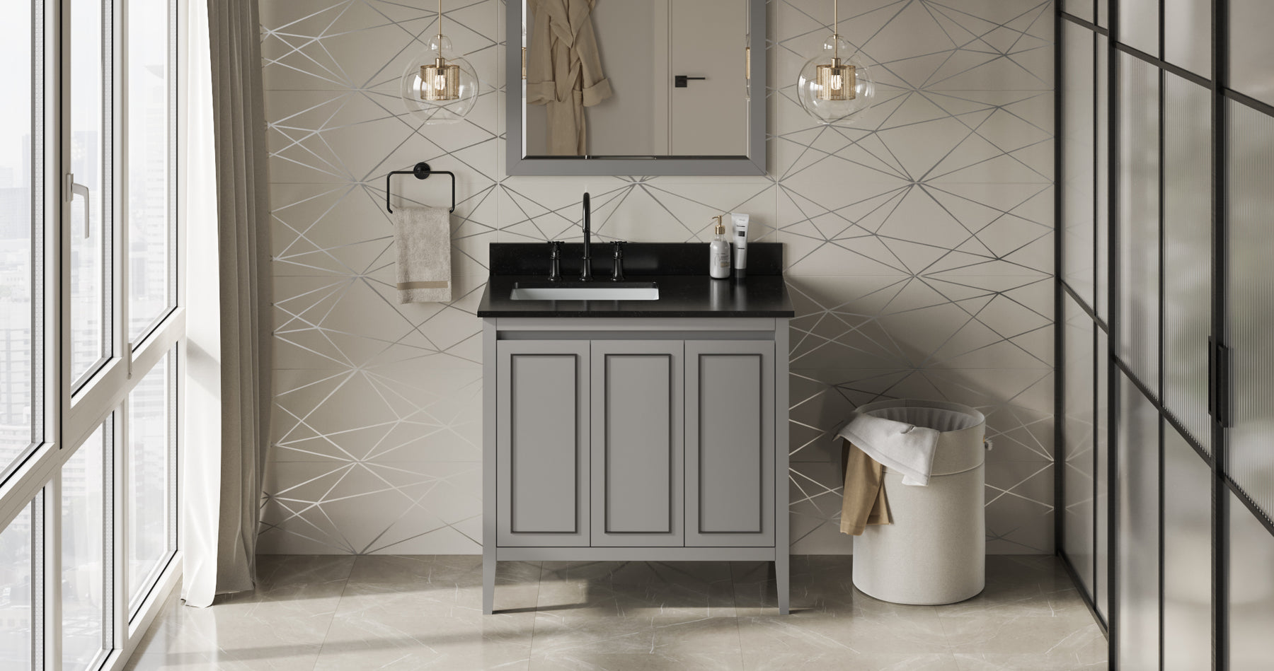 36" Grey Percival Vanity, left offset, Black Granite Vanity Top, undermount rectangle bowl | KitchBath