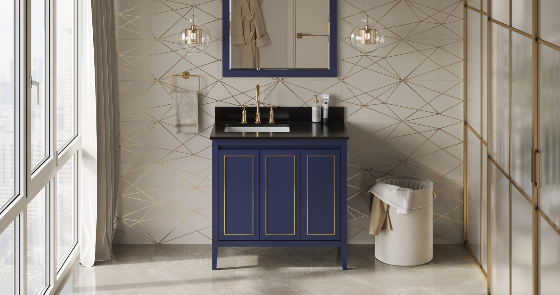 The Percival vanity collection by Jeffrey Alexander simply enriches a room with dignified grace. The subtle metal accent trim is all the ornamentation needed to generate a resplendent presence in a room designed with class. Behind each soft-close door lies a cabinet with an adjustable shelf and dovetail rollout drawer. Storage space is maximized by equipping the rollout drawers with full-extension soft-close undermount slides. Black vanities are trimmed with glistening Polished Chrome hardware, Hale Blue and White are gilded with Satin Bronze hardware, and Grey is accented with Matte Black hardware. Top and rectangular porcelain bowl are included but not assembled. See our video in the Highlights section for more information. The included top has three holes cut for an 8” widespread faucet, and a 4” tall backsplash is included. The vanity top is designed to overhang ½” on each side of the vanity.