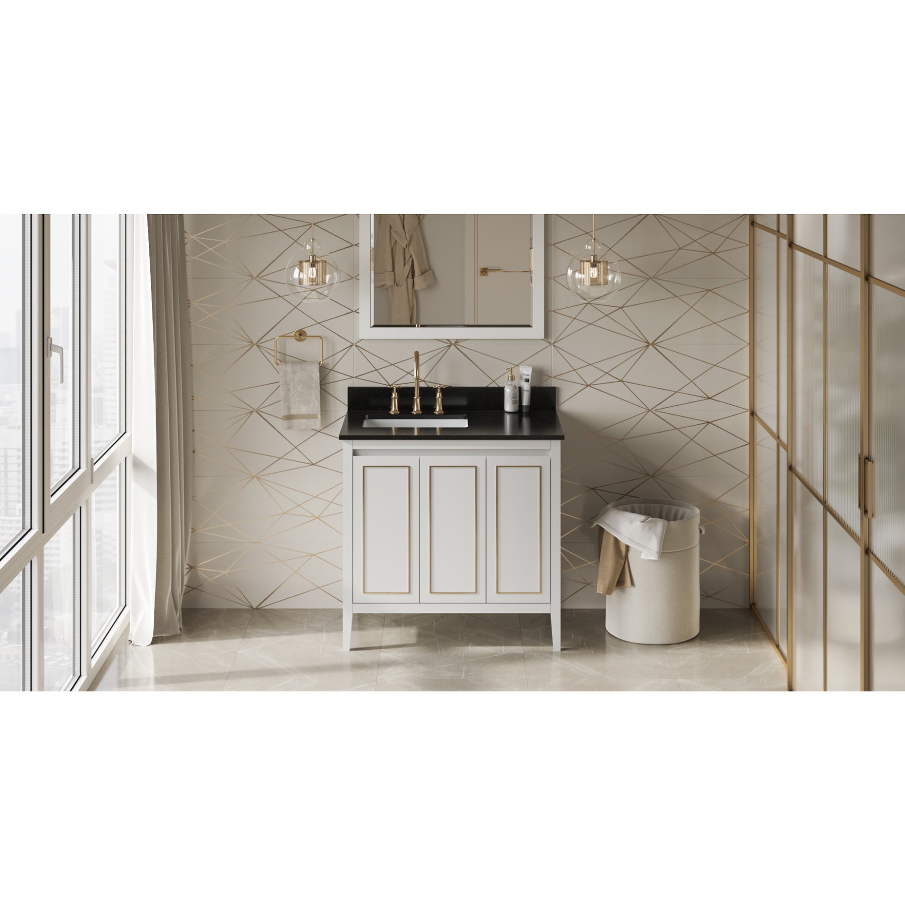 36" White Percival Vanity, left offset, Black Granite Vanity Top, undermount rectangle bowl