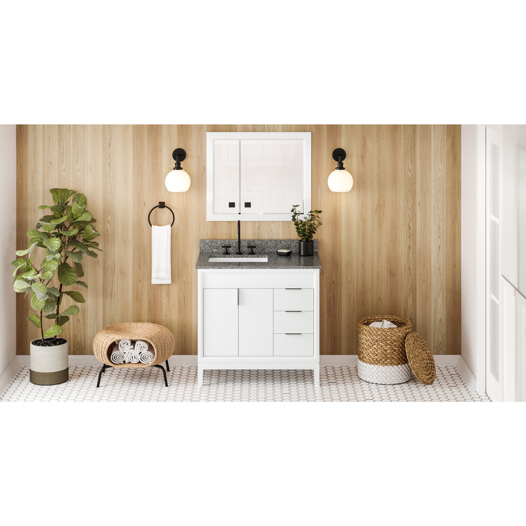 Jeffrey Alexander’s Theodora vanity collection provides a clean aesthetic using slab doors, simple lines, and minimal footprint tab pulls. The timeless mid-century design that Theodora illustrates merges gracefully with the modern style of today’s homes. Inside each cabinet is an adjustable shelf with a soft-close dovetail rollout drawer beneath. Each smooth front dovetail drawer features full-extension undermount slides for maximum storage. Polished Chrome tab pulls subtly accent vanities in Black, new Blue Steel, Grey, and White finishes, while Satin Bronze hardware accents the Hale Blue and Forest Green finishes. A top and rectangular porcelain bowl are included but not assembled. The included top has three holes cut for an 8” widespread faucet, and a 4” tall backsplash is included. The vanity top is designed to overhang 1/2” on each side of the vanity.
