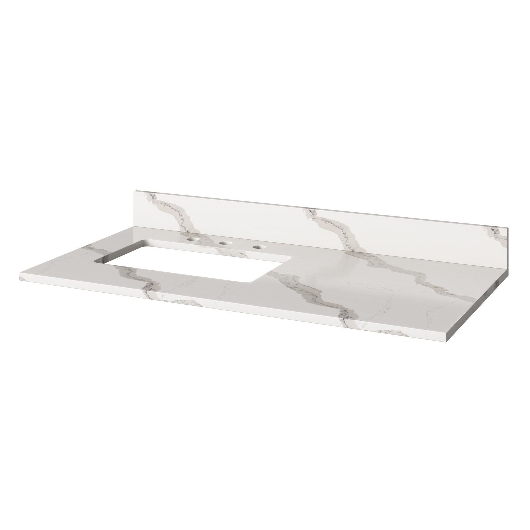 • Included top has three holes cut for an 8” widespread faucet and a 4” backsplash