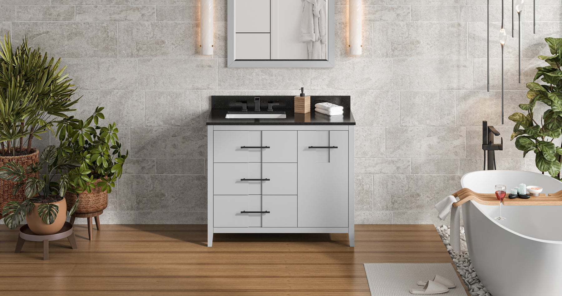 In a world of chaos, the bathroom can be transformed into your utopian Zen space with a Jeffrey Alexander Katara vanity. The smooth calmness of the doors and drawer fronts are accentuated by a slight recession behind the pulls. Each cabinet smoothly opens and closes with soft-close hinges and holds an adjustable shelf with a dovetail rollout drawer that features full -extension undermount slides for the best access to the entire drawer. Dominique knobs and pulls in Satin Bronze adorn vanities in Hale Blue and Forest Green, Brushed Gold makes its introductory appearance on the new Blue Steel vanities, Matte Black creates a refined contrast on the classic vanities in Grey and White, and Polished Chrome on Black vanities brings out a timeless combination. Top and bowl are not assembled. Some assembly required. Three holes are cut for an 8" widespread faucet, and a 4" tall backsplash is included. Included vanity top is designed to overhang ½” on each side of the vanity.