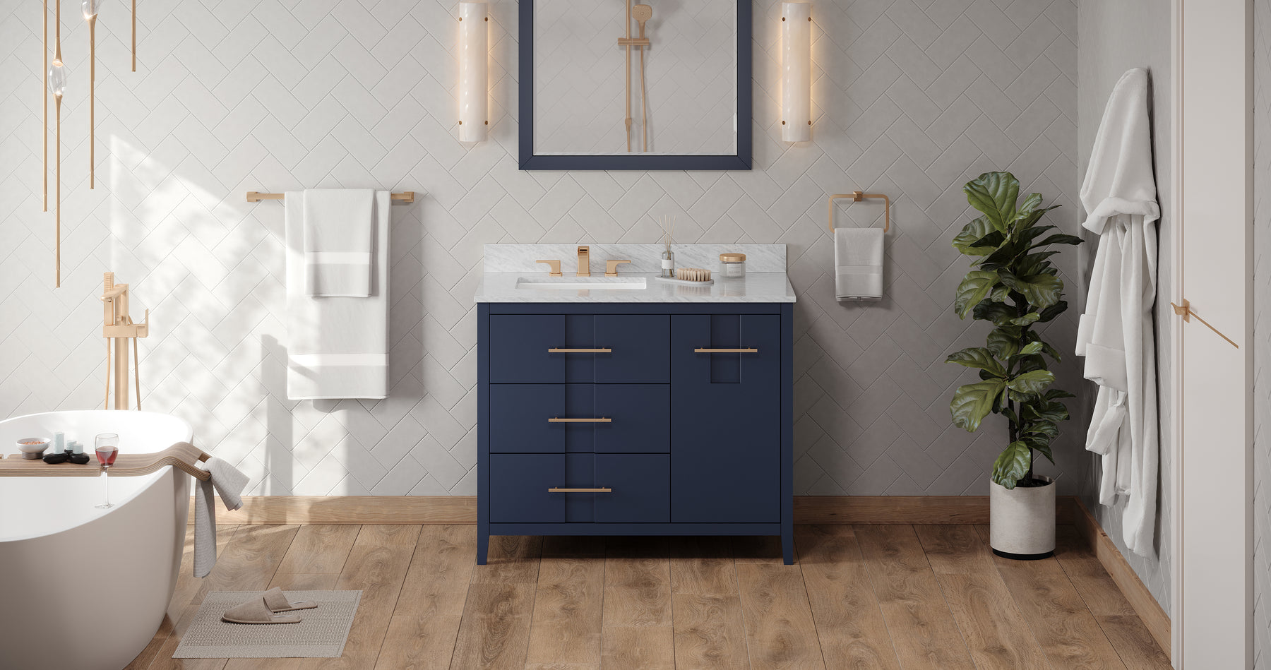 42" Hale Blue Katara Vanity, left offset, White Carrara Marble Vanity Top, undermount rectangle bowl | KitchBath