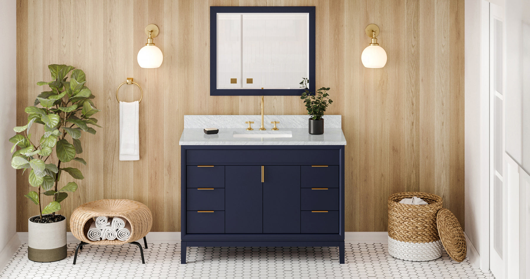 Jeffrey Alexander's Theodora vanity collection provides an aesthetic cleanse through slab doors, simple lines, and minimal footprint tab pulls. The timeless mid-century design that Theodora illustrates merges gracefully with the modern style of today's homes. Remaining true to the style, the 48" vanity is largely un-ornamented on the exterior yet within, boasts substantial storage space. Inside the cabinet is an adjustable shelf with a soft-close dovetail rollout drawer beneath. Each smooth front dovetail drawer features full extension undermount slides for maximum storage. Simplistic Satin Bronze tab pulls subtly accent this Hale Blue vanity. Theodora's beautifully minimal facade with its completely functional design is the ideal vanity to add any mid-century modern design. This vanity can accept a 49" top in any material with an oval or rectangle bowl cutout. Overall dimensions: 48" W x 21-1/2" D x 35" H. Top and bowl sold separately.