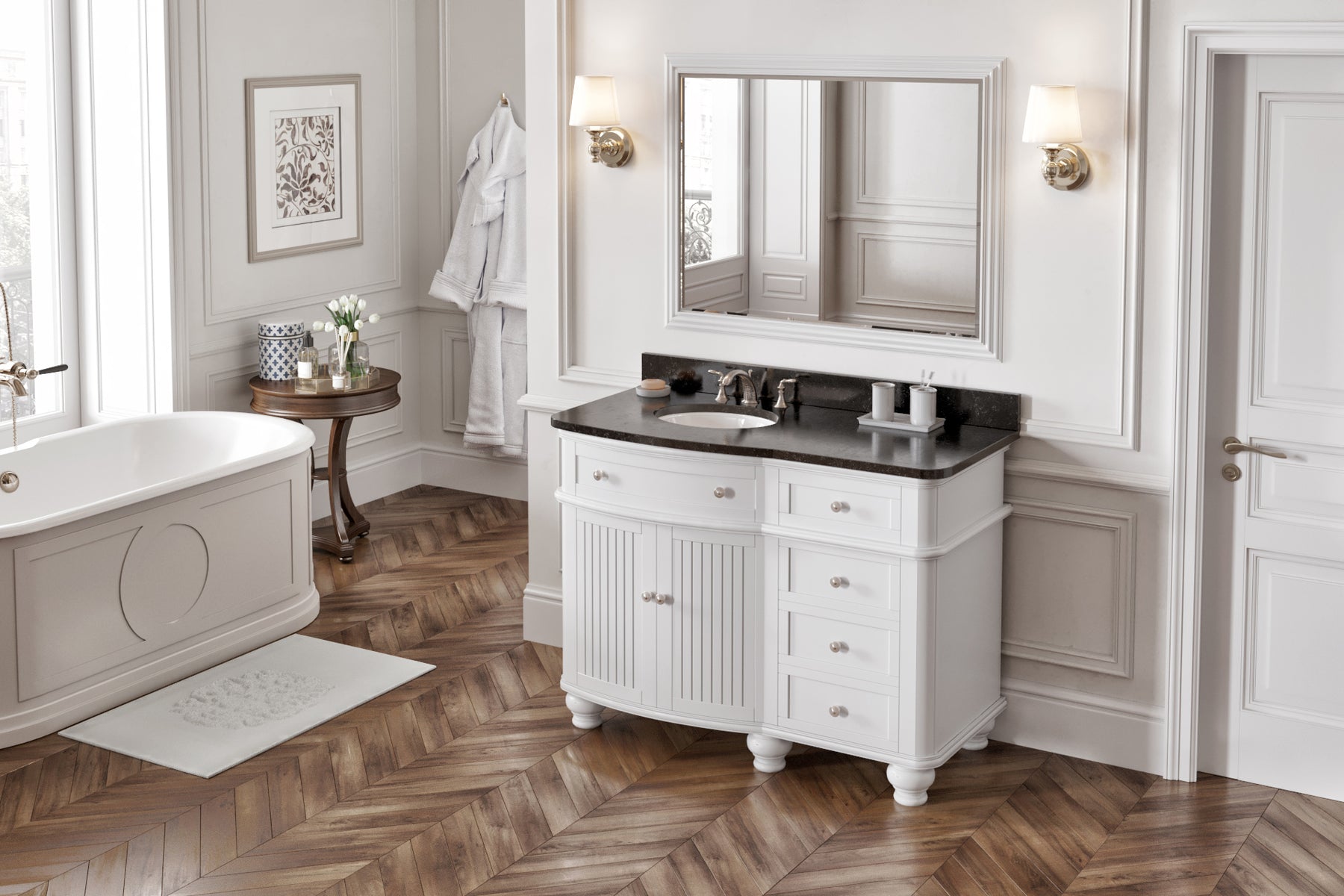 Simple beadboard doors, curved bun feet, and a rounded front form this cottage-style vanity collection. Transform any space with the Walnut or White finish to create a focal point that fits your style. An adjustable shelf is positioned in the cabinet and 4 offset soft-close drawers are equipped for optimal storage. White vanities are adorned with Jeffrey Alexander's Bremen knobs in Satin Nickel. Overall measurements: 48" W x 21-1/2" D x 35" H. The available top materials for Compton are 49" White Carrara Marble and 49" Black Granite. Both are designed specifically for the Compton collection and are available with oval or rectangle bowl cutouts. Top and bowl sold separately.