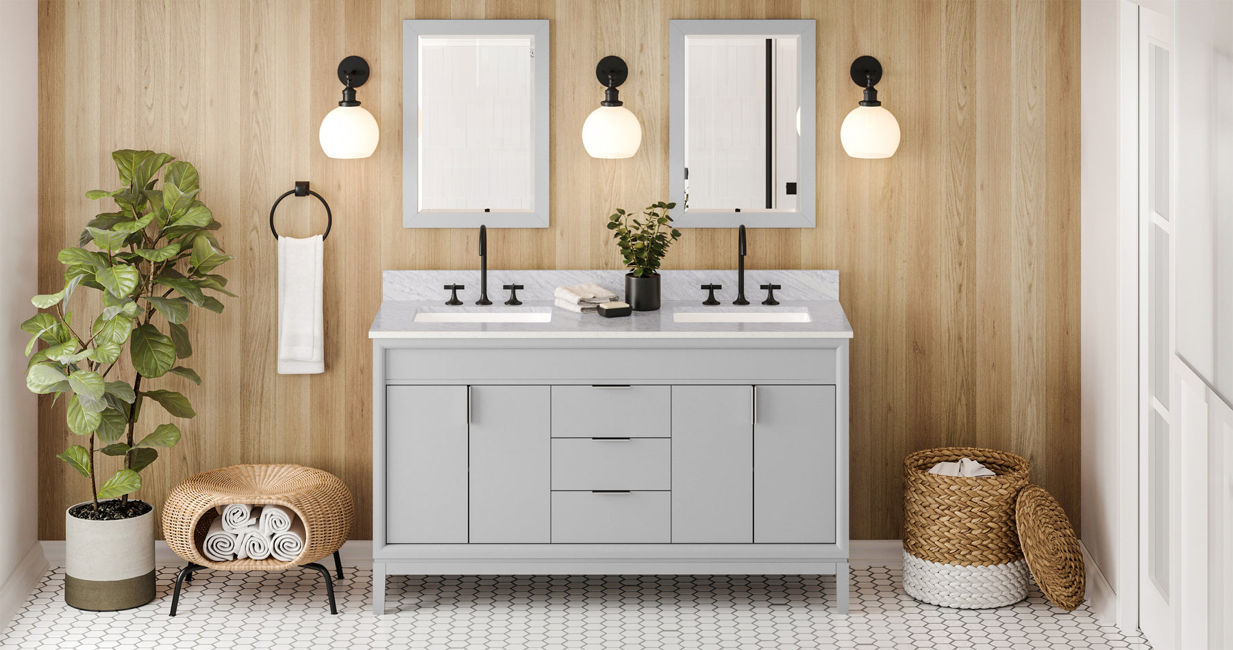 Jeffrey Alexander's Theodora vanity collection provides an aesthetic cleanse through slab doors, simple lines, and minimal footprint tab pulls. The timeless mid-century design that Theodora illustrates merges gracefully with the modern style of today's homes. Remaining true to the style, the 60" double vanity is largely un-ornamented on the exterior yet within, boasts substantial storage space. Inside each cabinet is an adjustable shelf with a soft-close dovetail rollout drawer beneath. Each smooth front dovetail drawer features full extension undermount slides for maximum storage. Simplistic Polished Chrome tab pulls subtly accent this Grey vanity. Theodora's beautifully minimal facade with its completely functional design is the ideal vanity to add any mid-century modern design. This vanity can accept a 61" top in any material with oval or rectangle bowl cutouts. Overall dimensions: 60" W x 21-1/2" D x 35" H. Top and bowls sold separately.