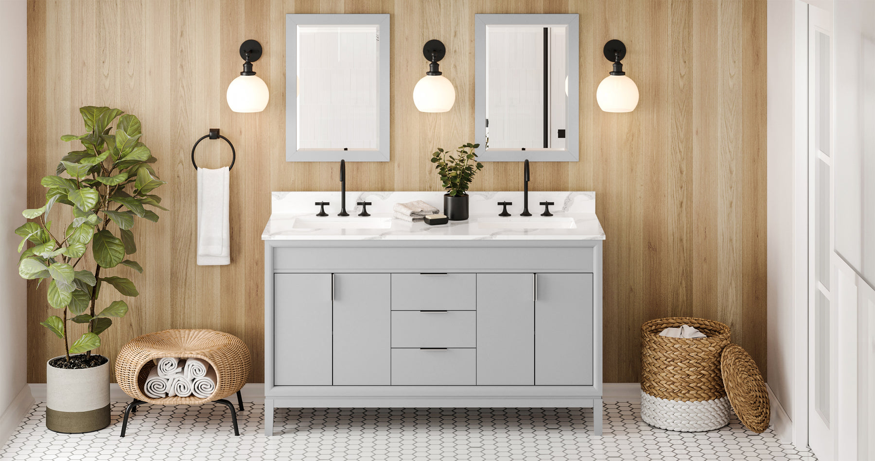 60" Grey Theodora Vanity, double bowl, Calacatta Vienna Quartz Vanity Top, two undermount rectangle bowls | KitchBath
