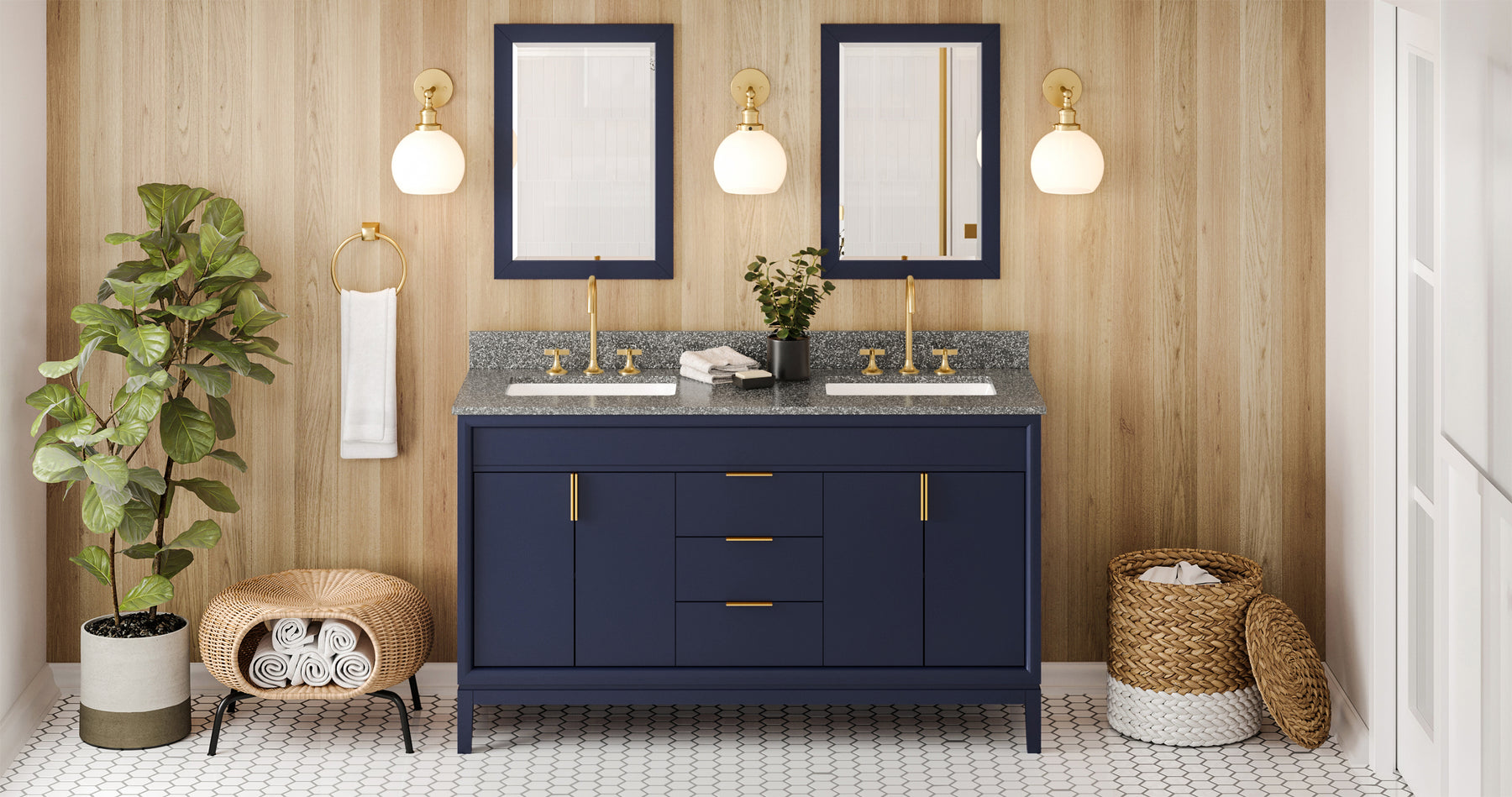 Jeffrey Alexander’s Theodora vanity collection provides a clean aesthetic using slab doors, simple lines, and minimal footprint tab pulls. The timeless mid-century design that Theodora illustrates merges gracefully with the modern style of today’s homes. Inside each cabinet is an adjustable shelf with a soft-close dovetail rollout drawer beneath. Each smooth front dovetail drawer features full-extension undermount slides for maximum storage. Polished Chrome tab pulls subtly accent vanities in Black, new Blue Steel, Grey, and White finishes, while Satin Bronze hardware accents the Hale Blue and Forest Green finishes. A top and rectangular porcelain bowls are included but not assembled. The included top has holes cut two 8” widespread faucets, and a 4” tall backsplash is included. The vanity top is designed to overhang 1/2” on each side of the vanity.