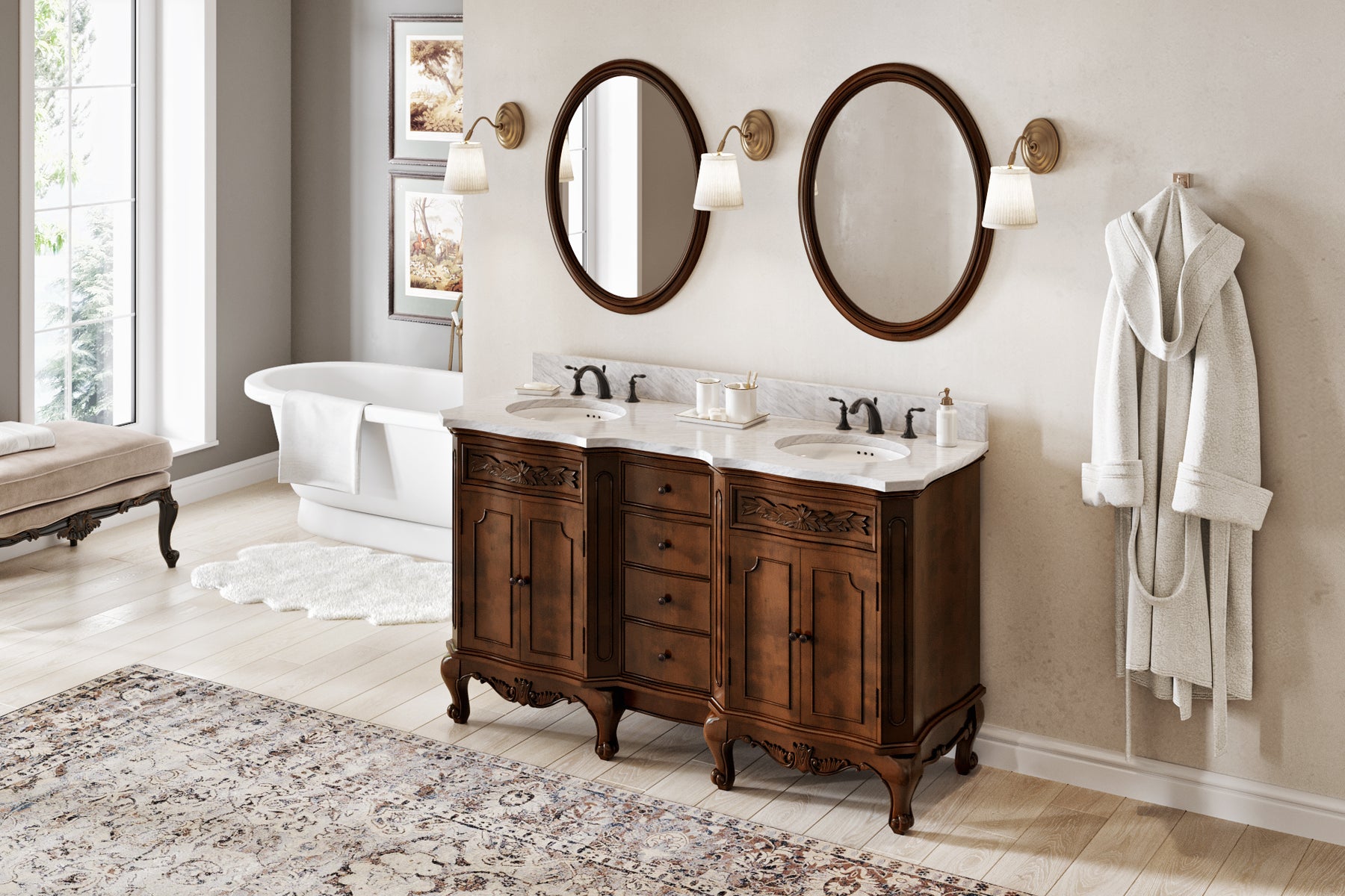 Carved floral onlays and French scrolled legs add sophistication to this traditional vanity. A large cabinet provides storage space for towels and linens. four soft-close drawers in the center of the two cabinets offer additional storage. The Nutmeg painted finish and Brushed Oil Rubbed Bronze knobs enhance the opulence of this vanity collection. The featured decorative hardware Element's Lindos collection. Overall measurements: 60" W x 21-1/2" D x 35" H. The available top materials for Clairemont are 61" White Carrara Marble and 61" Black Granite. Both are designed specifically for the Clairemont collection and are available with oval or rectangle bowl cutouts. Top and bowls sold separately.