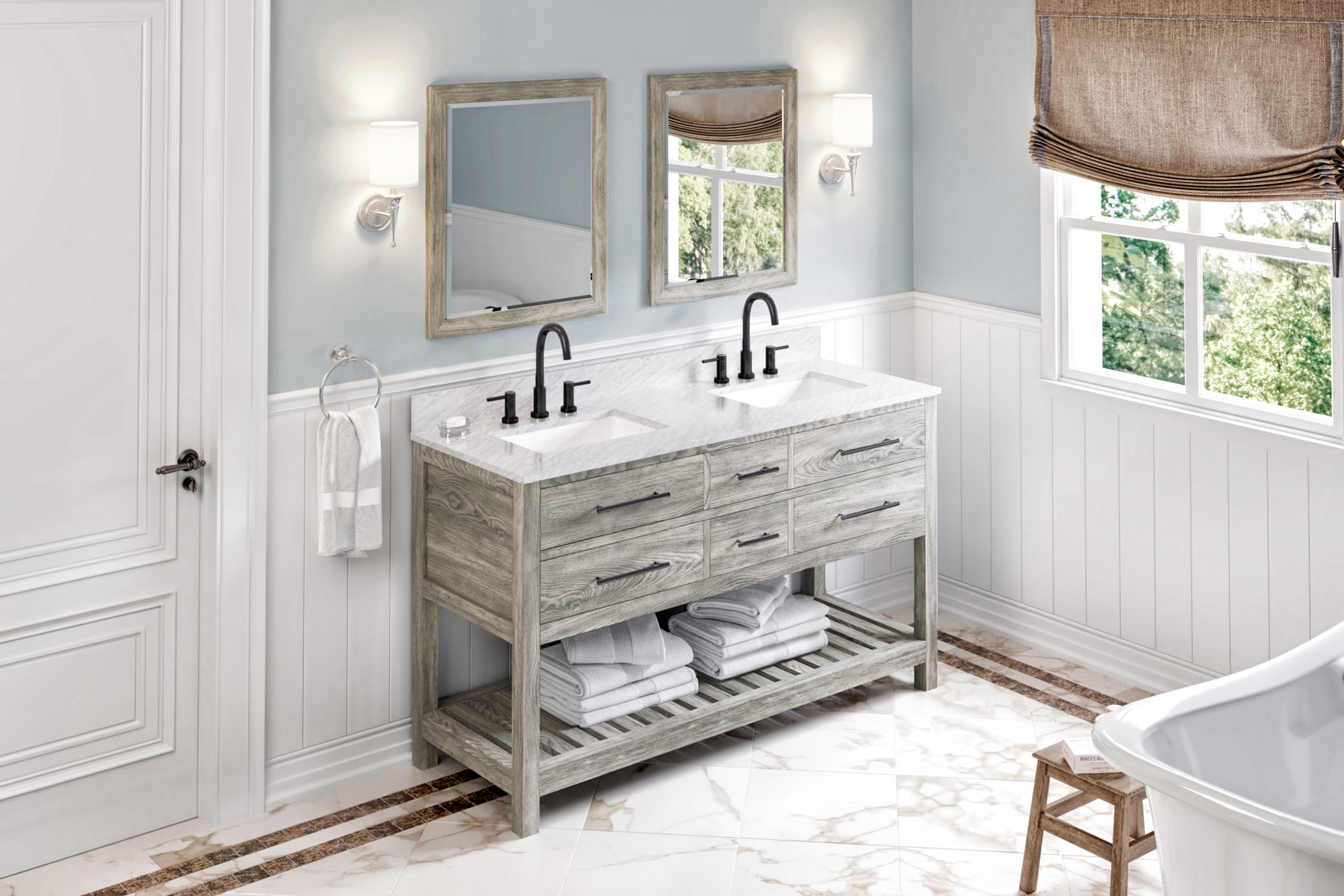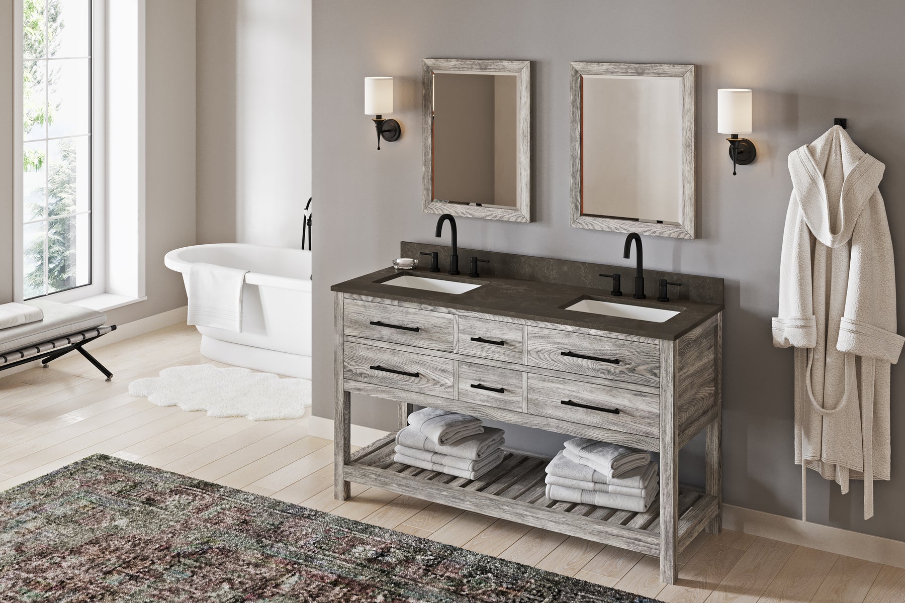 Escape to the seaside with the Wavecrest vanity collection. Crisp, clean edges and a slatted bottom shelf evoke a coastal calm feeling. The top drawer fronts are transformed into hidden tipout storage space with solid hardwood custom-sized tipout trays. Beneath the tipout storage are solid hardwood dovetail drawers with full-extension concealed soft-close undermount slides. Extra storage is provided by a pair of center hardwood dovetail drawers. This Weathered Grey vanity is adorned with Jeffrey Alexander Key West pulls in trendy Matte Black. Can accept a 61" top with two oval or rectangle bowl cutouts. Overall dimensions: 60" W x 21-1/2" D x 35" H. Top and bowls sold separately.