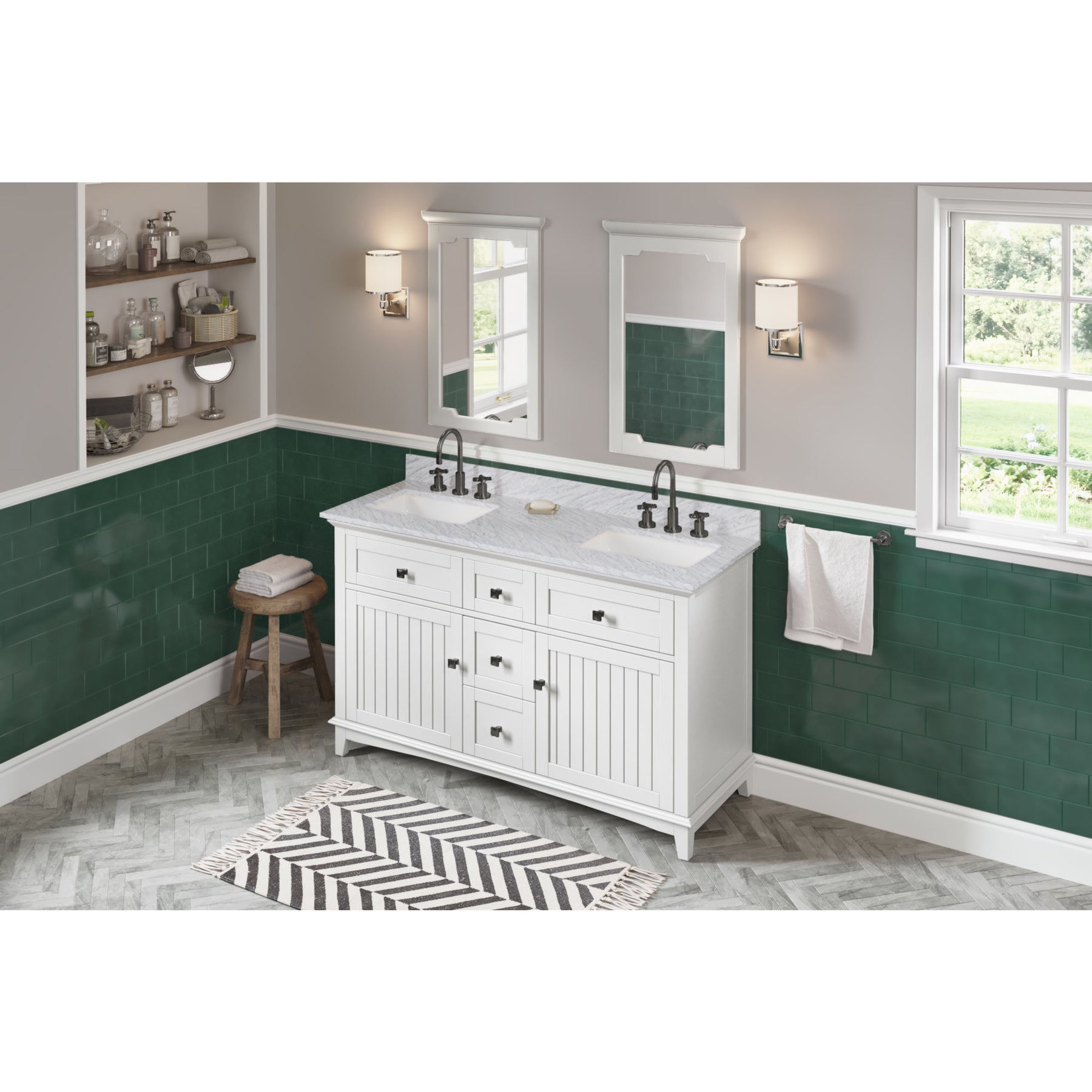 Savino provides a fresh twist on the classic Shaker style and includes innovative features to enhance the beauty of this vanity. Hardwood dovetail rollout drawers with full-extension soft-close undermount slides are integrated into the cabinet to make storage easier and more convenient. This 60" unit includes a set of hardwood dovetail drawers in the center. Savino vanities are also equipped with solid wood, custom-sized tipout storage trays on either side. This White vanity is adorned with Jeffrey Alexander's Annadale collection of knobs in trendy Matte Black. All slides and hinges are soft-close. This vanity can accept a 61" top with two oval or rectangle bowl cutouts. Overall dimensions: 60" W x 21-1/2" D x 35" H. Top and bowl sold separately.