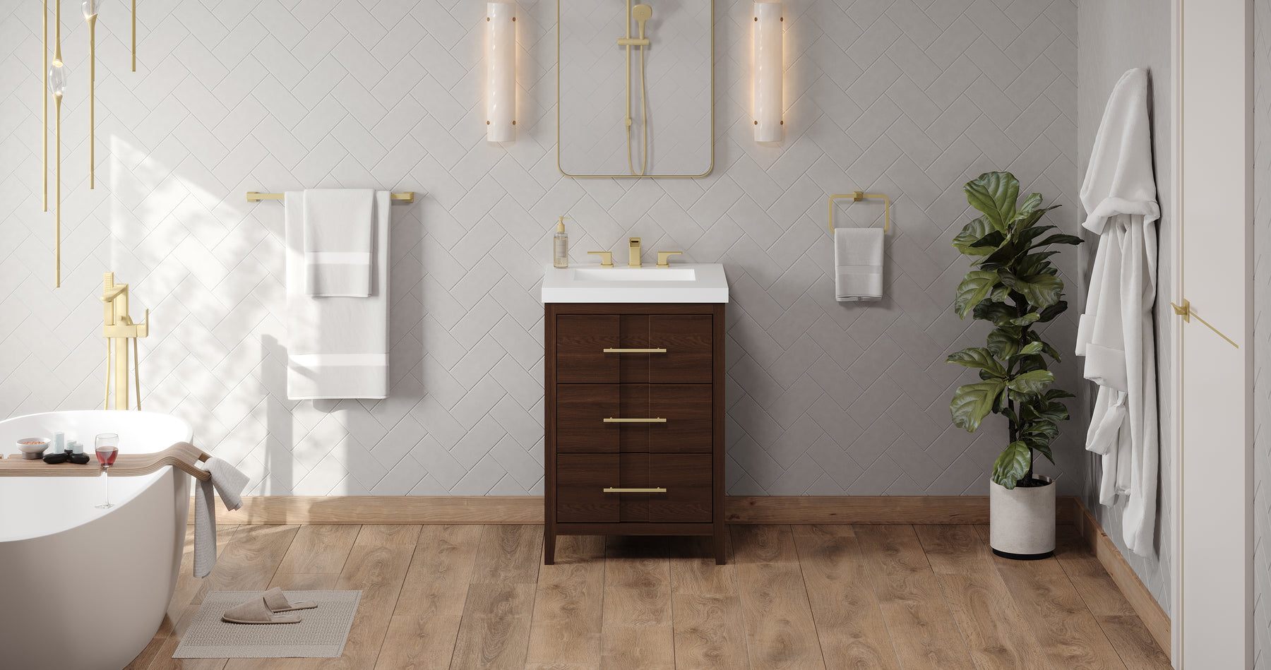 Katara 24" Single Bathroom Vanity Set Dark Walnut, White Resin Vanity Top, Rectangle Bowl | KitchBath