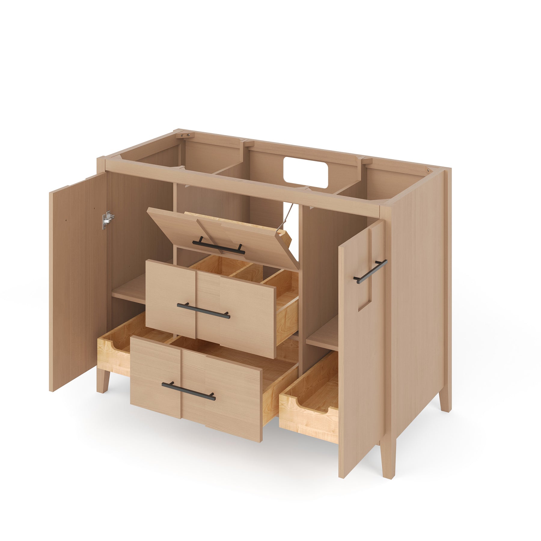 • Custom-sized, hardwood tipout storage tray and two dovetail drawers for extra storage