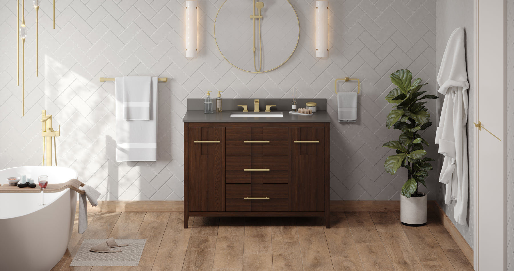 In a world of chaos, the bathroom can be transformed into your utopian Zen space with a Jeffrey Alexander Katara vanity. The smooth calmness of the doors and drawer fronts are accentuated by a slight recession behind the pulls. Each cabinet smoothly opens and closes with soft-close hinges and holds an adjustable shelf with a dovetail rollout drawer that features full -extension undermount slides for the best access to the entire drawer. Dominique knobs and pulls in Satin Bronze adorn vanities in Hale Blue and Forest Green, Brushed Gold makes its introductory appearance on the new Blue Steel vanities, Matte Black creates a refined contrast on the classic vanities in Grey and White, and Polished Chrome on Black vanities brings out a timeless combination. Top and bowl are not assembled. Some assembly required. Three holes are cut for an 8" widespread faucet, and a 4" tall backsplash is included. Included vanity top is designed to overhang ½” on each side of the vanity.