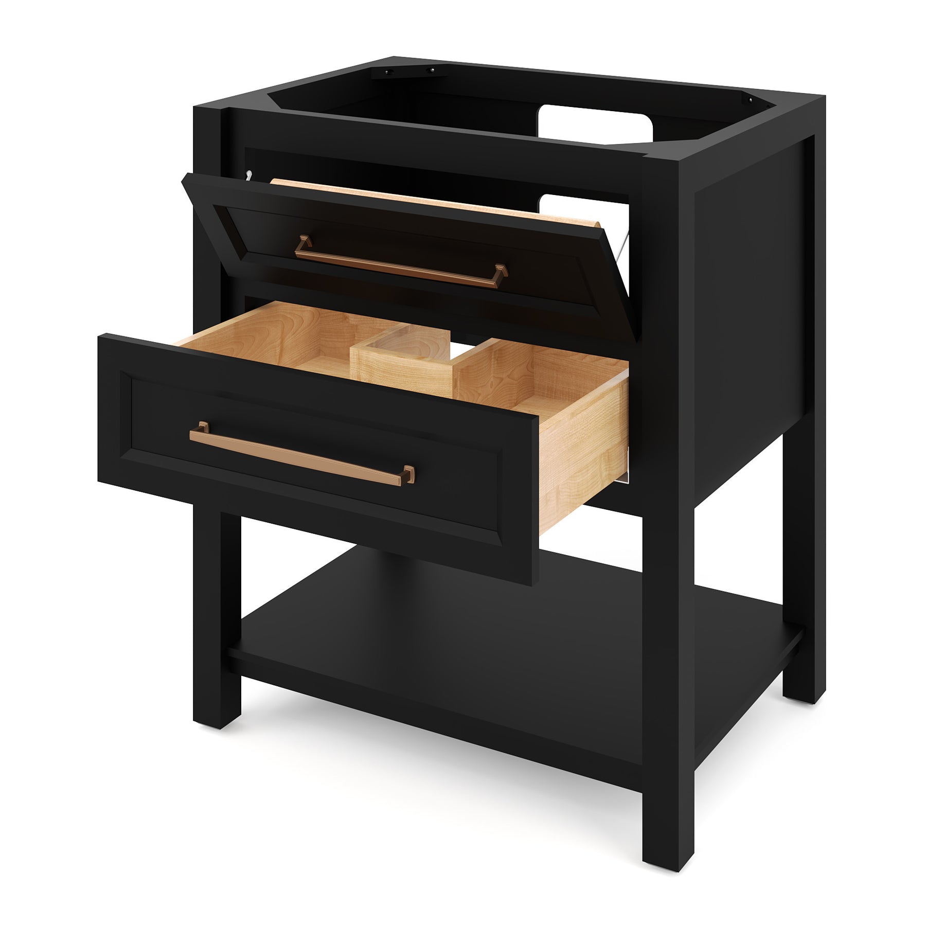 Discover the Kipling Vanity Collection by Jeffrey Alexander—a Shaker-style classic exquisitely re-imagined. This collection seamlessly blends timeless Shaker aesthetics with modern functionality. Hardwood craftsmanship, square legs, and an open bottom shelf gracefully unite style and practicality. This 30" Kipling vanity features a dovetail drawer and hardwood tipout tray that provide functional storage while being adorned by Jeffrey Alexander’s Richard pulls to emphasize both quality and elegance. Most of the vanity tops are designed to overhang 1/2" on each side of the vanity and feature either three holes cut for an 8" widespread faucet or a single faucet hole and include a 4" tall backsplash.