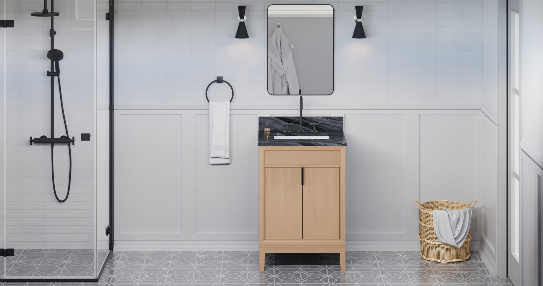 Jeffrey Alexander’s Theodora vanity collection provides a clean aesthetic using slab doors, simple lines, and minimal footprint tab pulls. The timeless mid-century design that Theodora illustrates merges gracefully with the modern style of today’s homes. Inside each cabinet is an adjustable shelf with a soft-close dovetail rollout drawer beneath. Each smooth front dovetail drawer features full-extension undermount slides for maximum storage. Polished Chrome tab pulls subtly accent vanities in Black, new Blue Steel, Grey, and White finishes, while Satin Bronze hardware accents the Hale Blue and Forest Green finishes. A top and rectangular porcelain bowl are included but not assembled. The included top has three holes cut for an 8” widespread faucet, and a 4” tall backsplash is included. The vanity top is designed to overhang 1/2” on each side of the vanity.