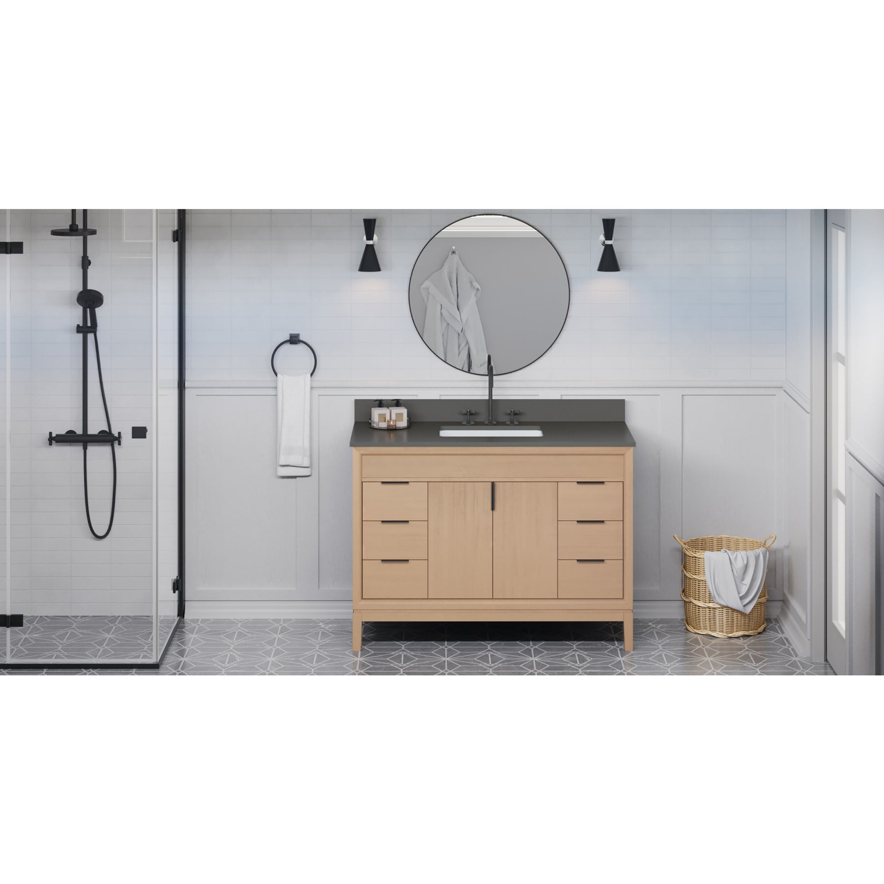 Theodora 48" Single Bathroom Vanity Set Natural Oak, Grey Quartz Vanity Top, Rectangle Bowl | KitchBath