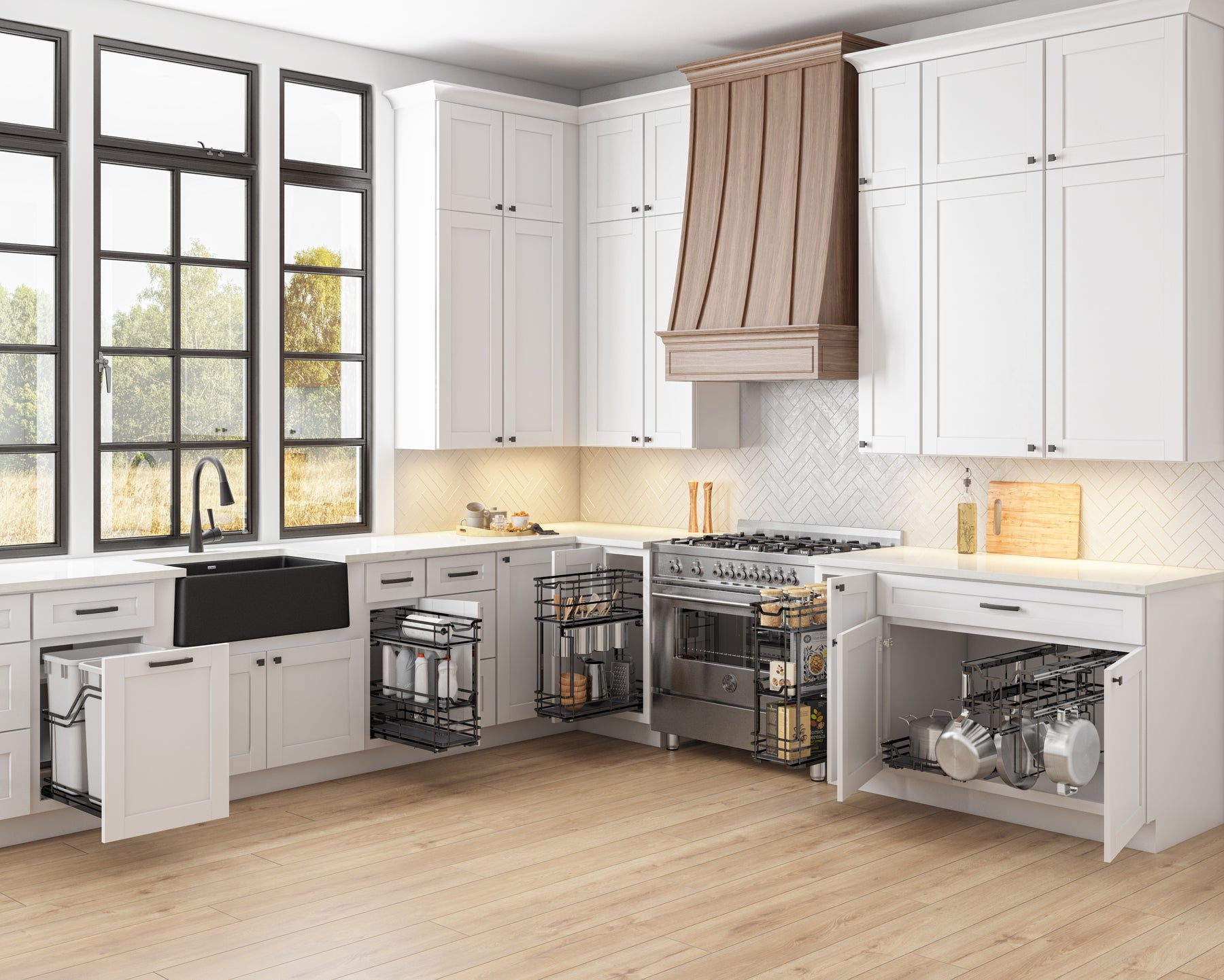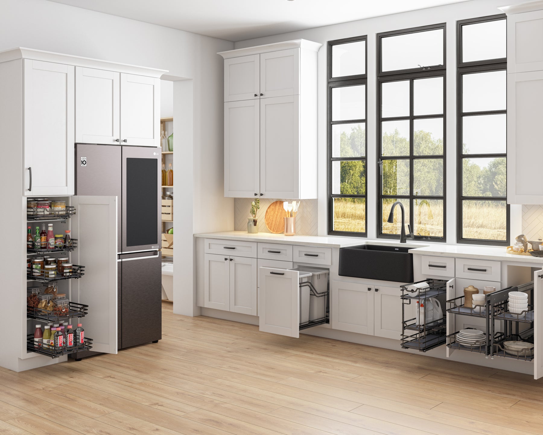 Turn your static cabinet shelves into pullout drawers with Storage with Style's metal 15" soft-close pullout baskets in Black Nickel finish. Storage with Style's curved flat wire design details flow across all organizers to create a cohesive collection identity. Designed to be the ultimate customizable solution, you can mount the baskets on the cabinet floor or side mount them to the cabinet wall. Easily stack multiple baskets with optional pilaster system (sold separately). Great for adding easy access to base cabinets or pantry cabinets by stacking multiple units. Removable grey acrylic liners keep items secure on the shelf and allow for easy cleaning. Designed for a 15" cabinet opening. To view available specifications and installation instructions select all product options.