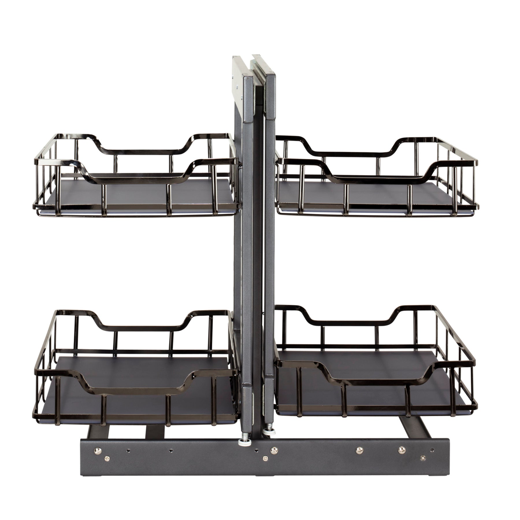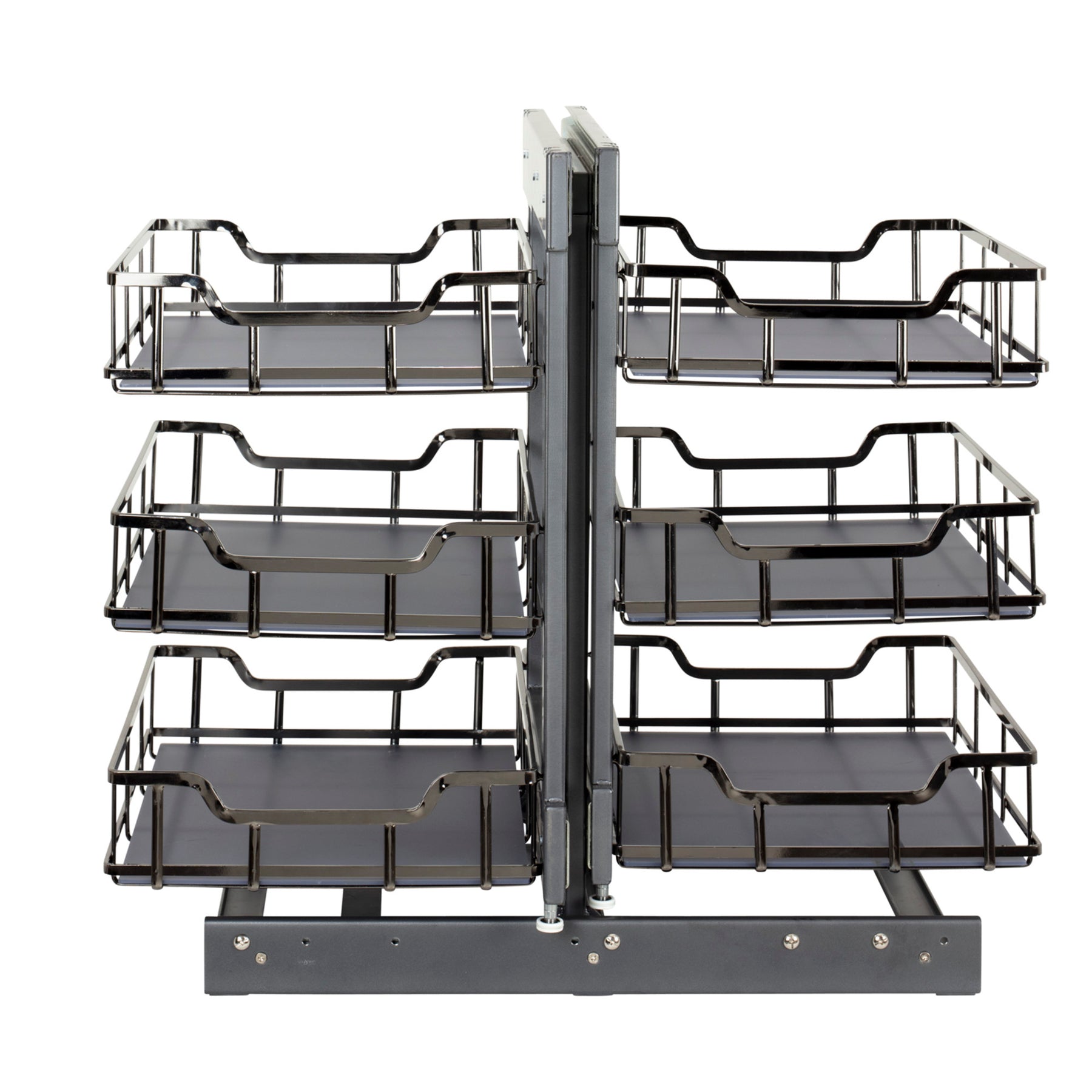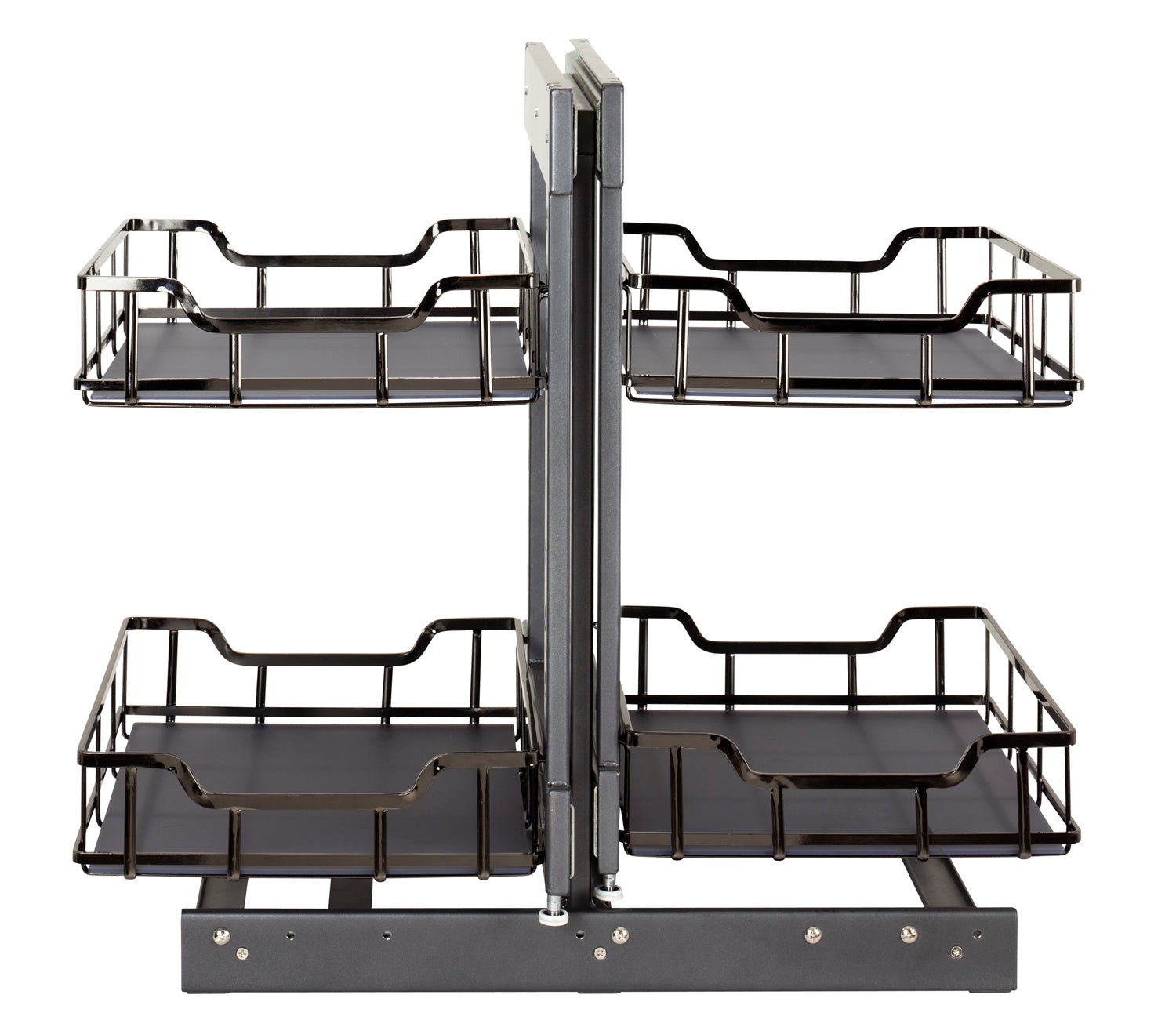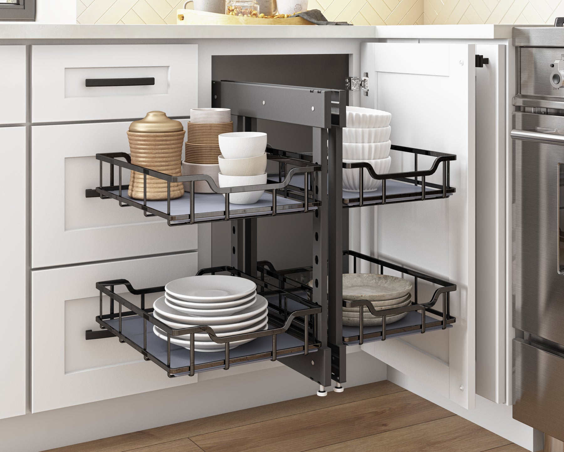 Bring style and functionality to your blind corner cabinet! Storage with Style's Blind Corner Organizer maximizes space in blind corner cabinets while allowing the user full accessibility to the entire unit as all four baskets extend out of the cabinet for full access. This blind corner organizer is designed to fit most 48" full-height blind corner cabinets and features acrylic liners for a smooth shelf bottom that is also easy to clean. Extra clearance is built in to prevent interference with adjacent hardware when fully extended out of the cabinet. Soft-close ball-bearing slides and heavy duty materials making it durable, stable and stylish. The unit is easy to assemble and installs for either left or right-handed applications. Add an extra set of baskets to make a 3-tier shelf organizer. Black Nickel finish. To view available specifications and installation instructions select all product options.
