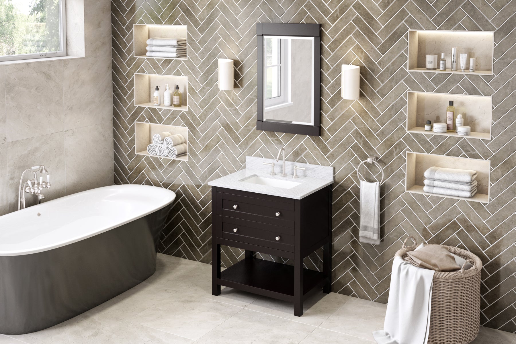 30" Espresso Astoria Vanity, White Carrara Marble Vanity Top, undermount rectangle bowl | KitchBath